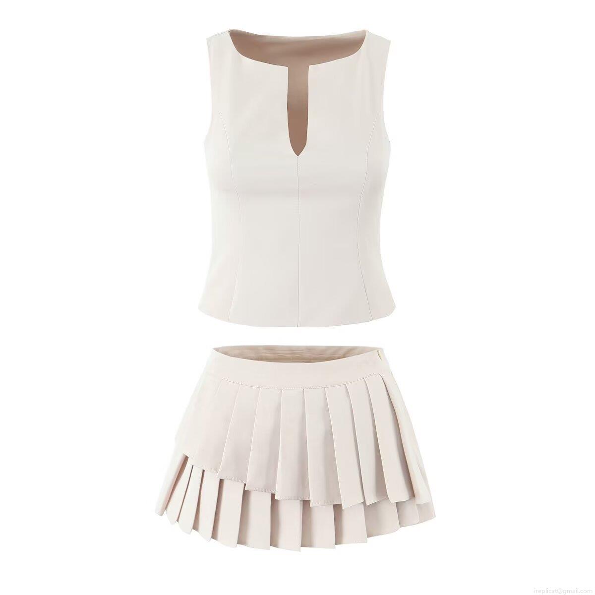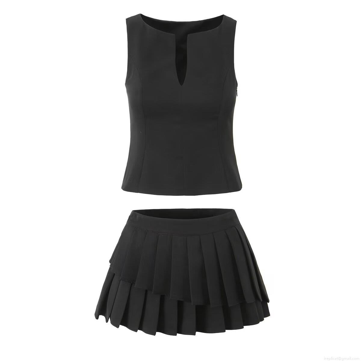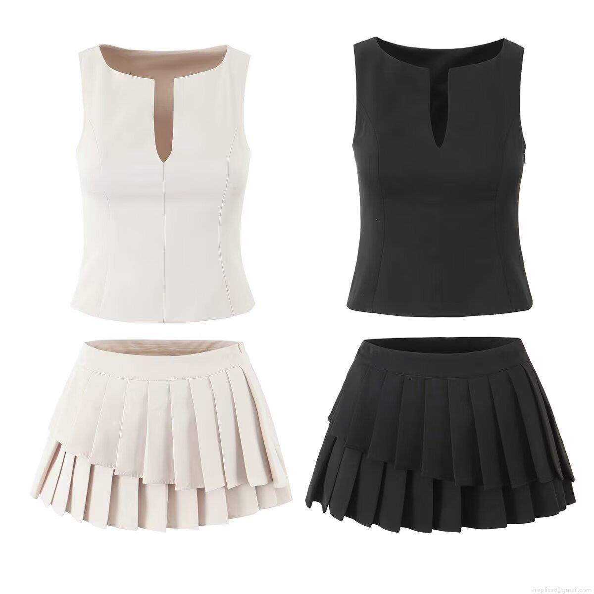 • Women's Chic Two-Piece Set Sleeveless V-Neck Crop Top and Tiered Pleated Mini Skirt Polyester Spandex Solid Color Outfits for Women Clubwear Party Streetwear