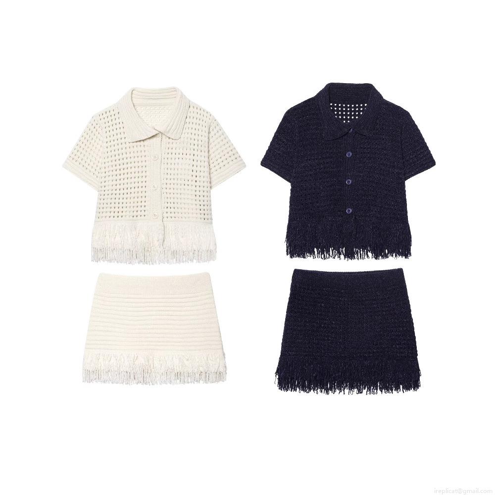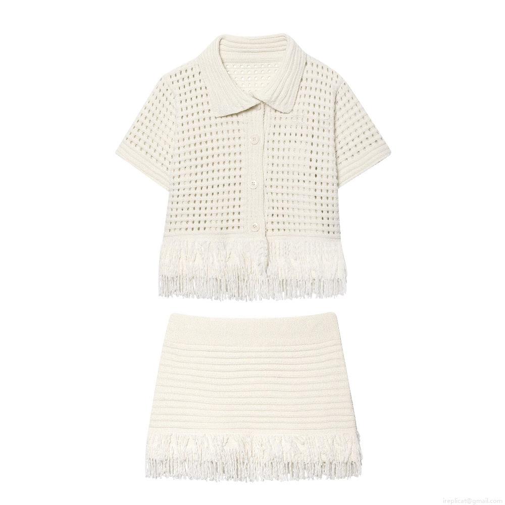 • Women's Crochet Knit 2-Piece Set Tassel Fringe Hollow Out Short Sleeve Polo Shirt And Mini Skirt Summer Beach Holiday Bohemian Outfits