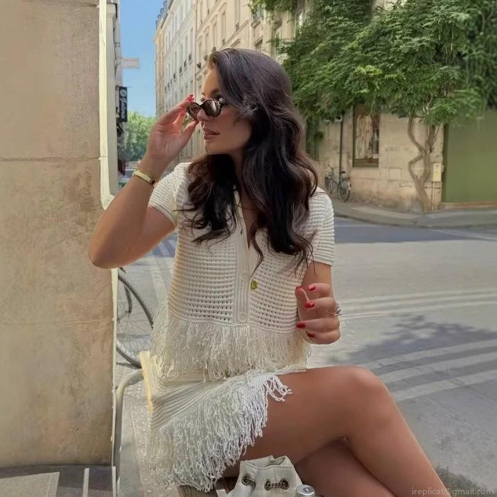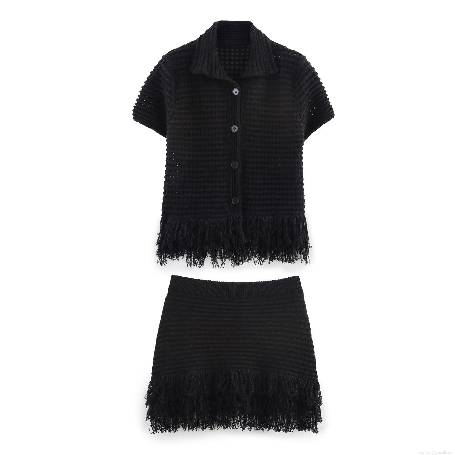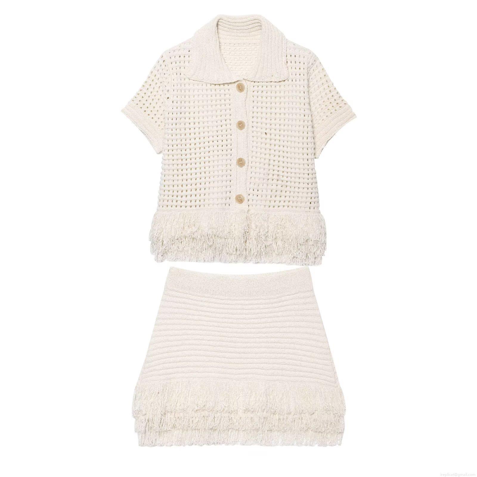 • Women's Crochet Knit Two Piece Set Hollow Out Tassel Short Sleeve Polo Cardigan and Mini Skirt Bohemian Summer Vacation Beach Outfits