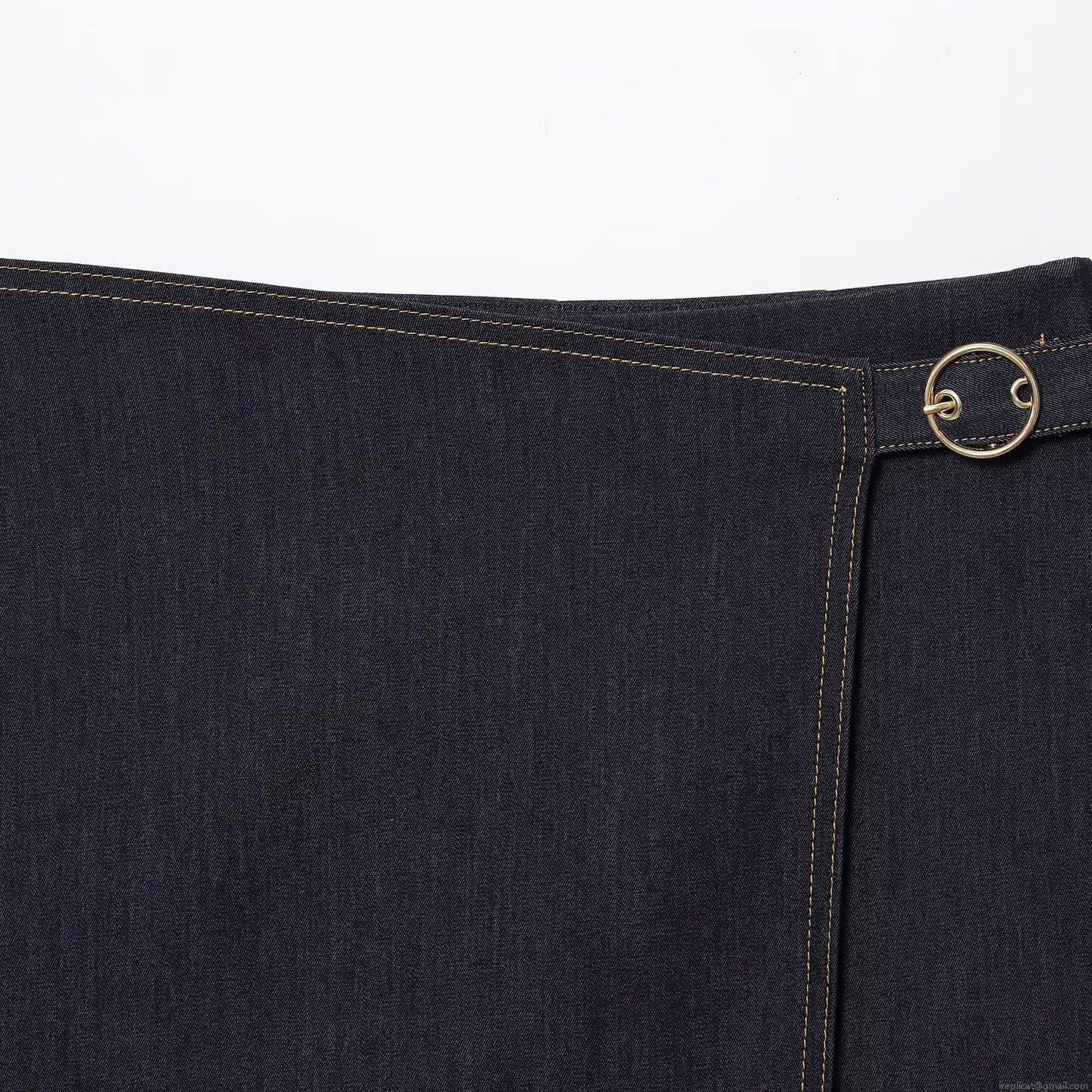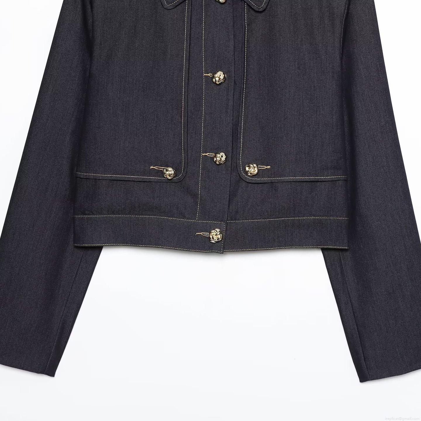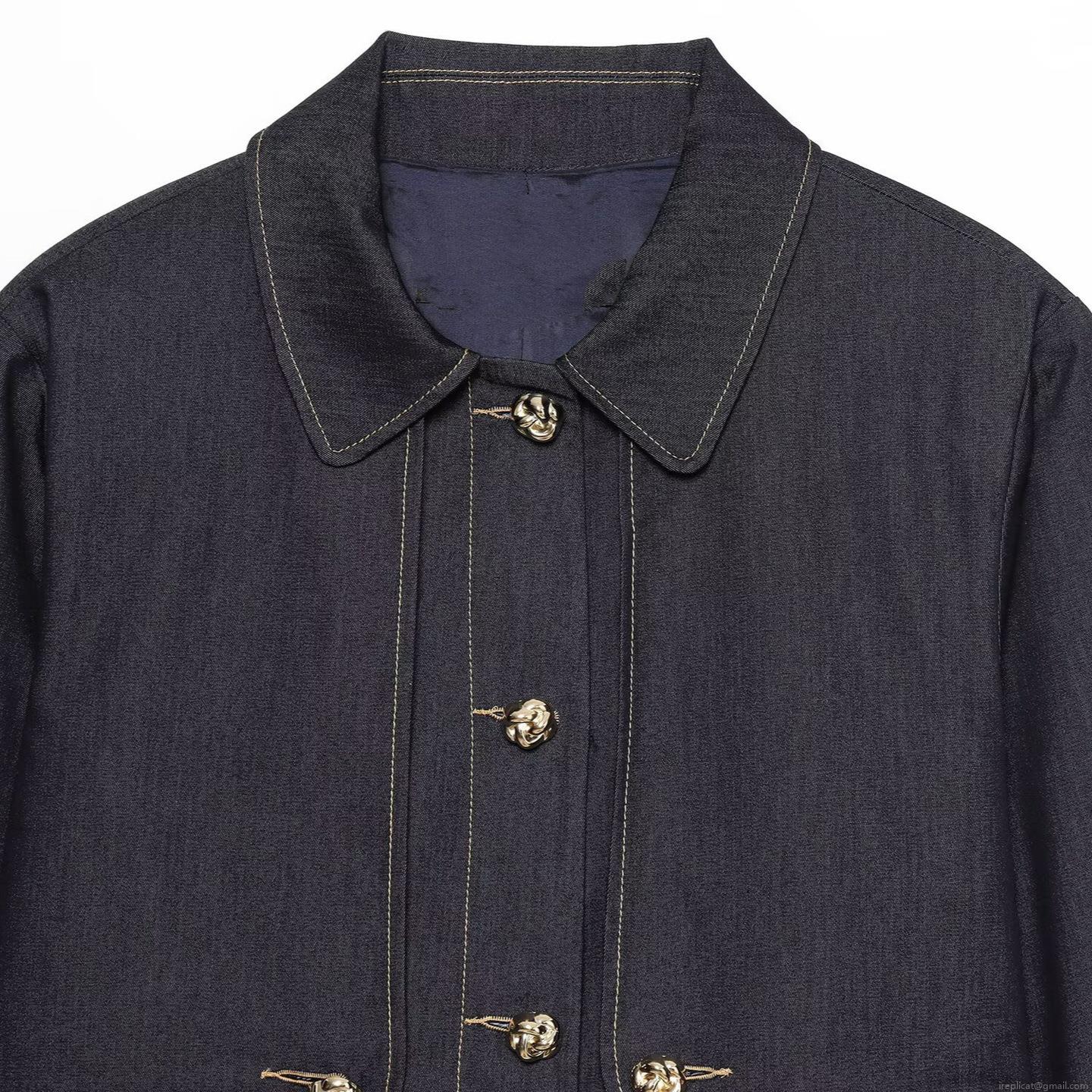 • Women's Dark Blue Denim Two Piece Set Long Sleeve Short Jacket And Wrap Mini Skirt With Gold Metal Buttons Casual Autumn Fashion Outfit