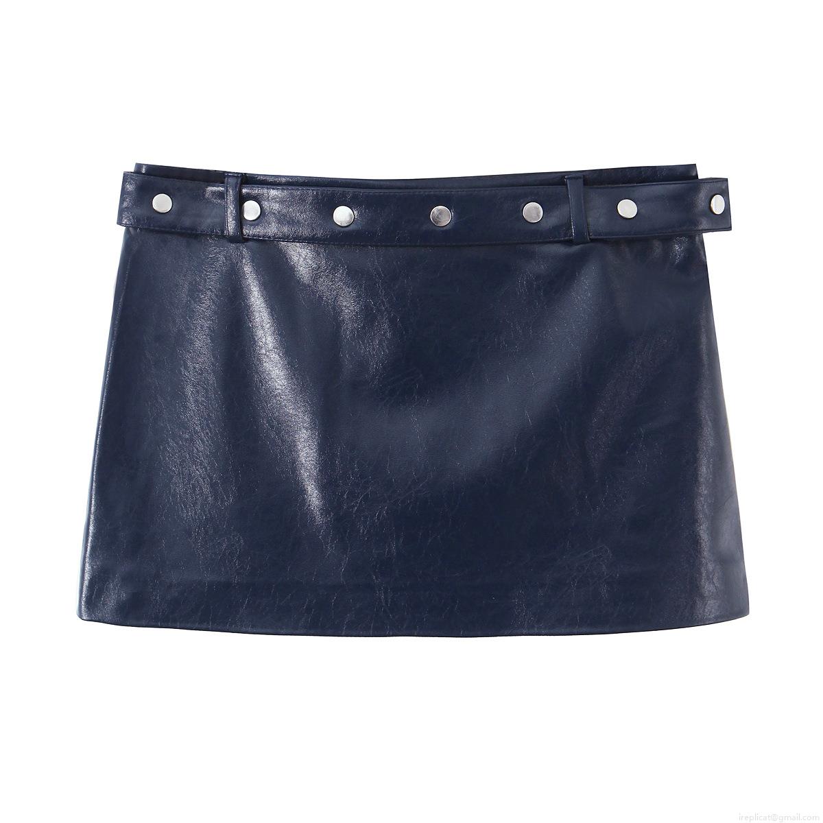 Women's Deep Blue Faux Leather Two Piece Set Stand Collar Sleeveless Vest Top And Mini Skirt With Rivet Belt Streetwear Fashion Outfit
