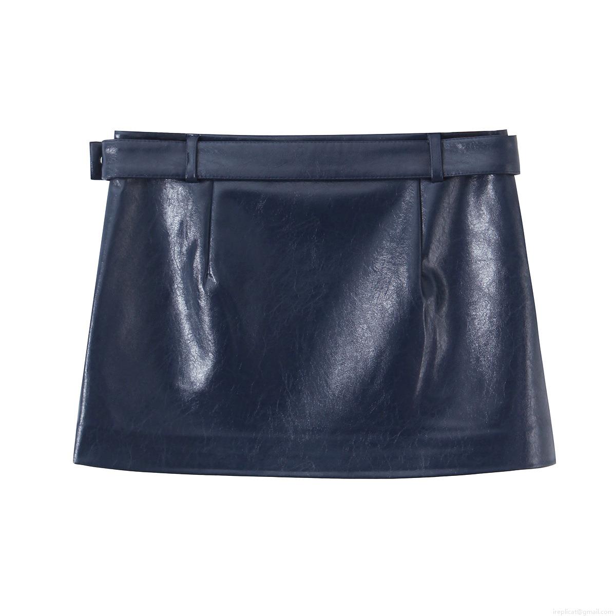 • Women's Deep Blue Faux Leather Two Piece Set Stand Collar Sleeveless Vest Top And Mini Skirt With Rivet Belt Streetwear Fashion Outfit