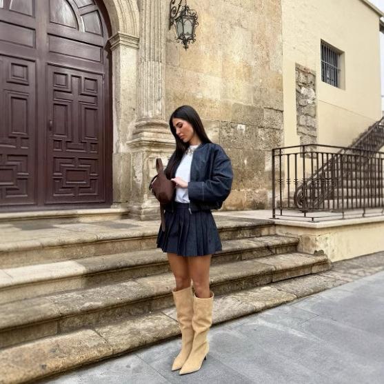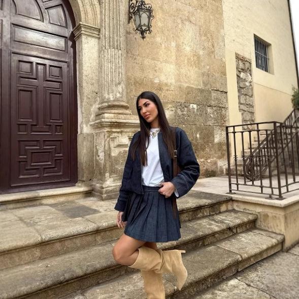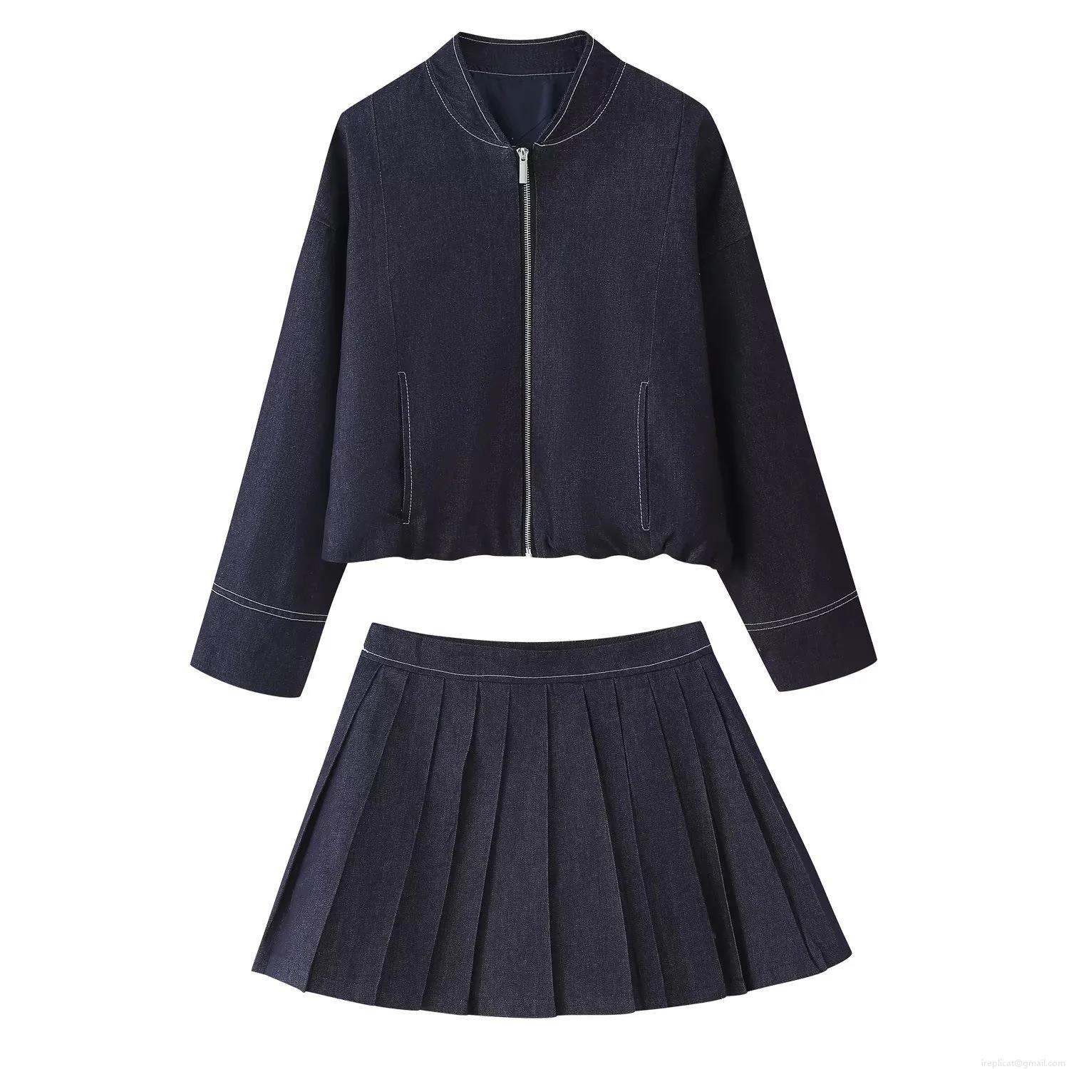 Women's Denim Style Two Piece Set Contrast Stitching Crop Bomber Jacket and High Waist Pleated Mini Skirt Streetwear Casual Outfit For Party Clubwear