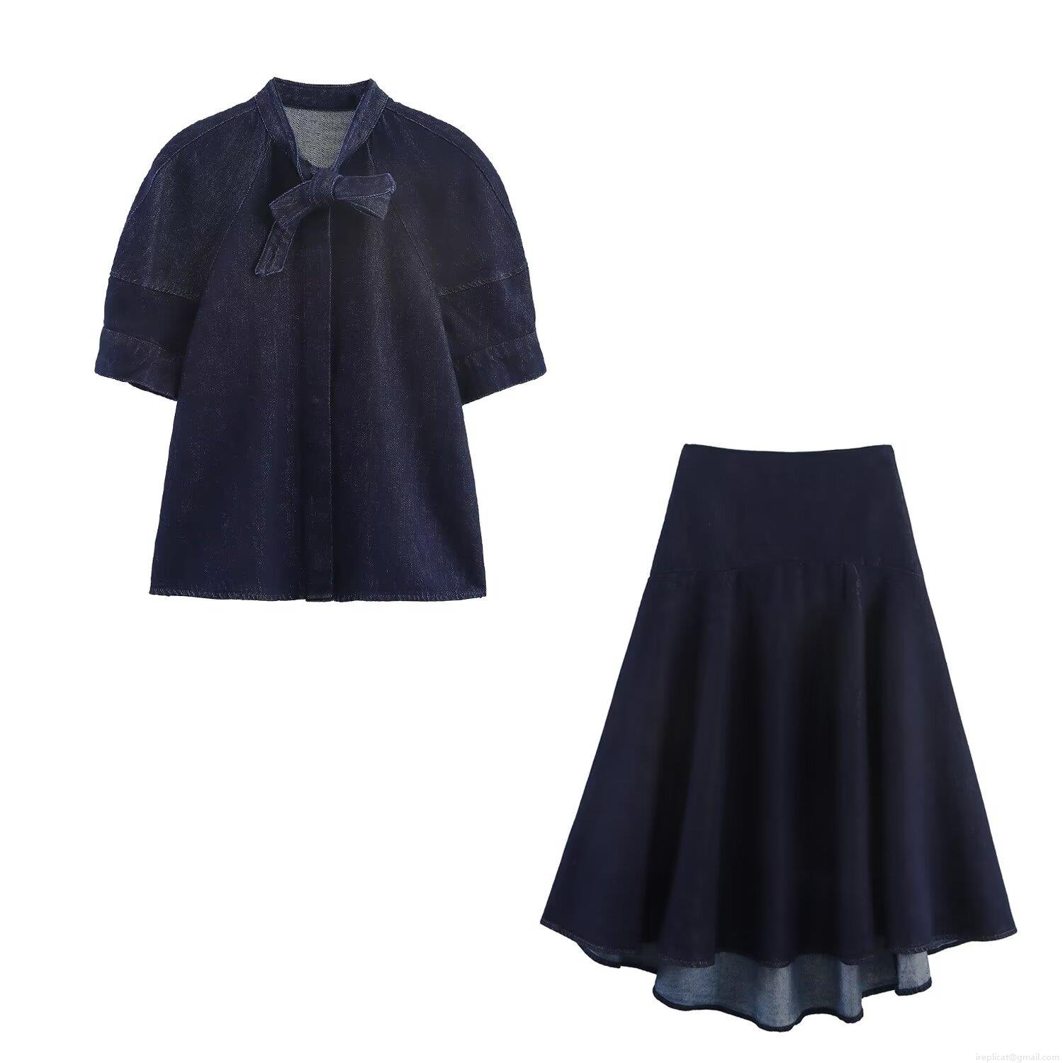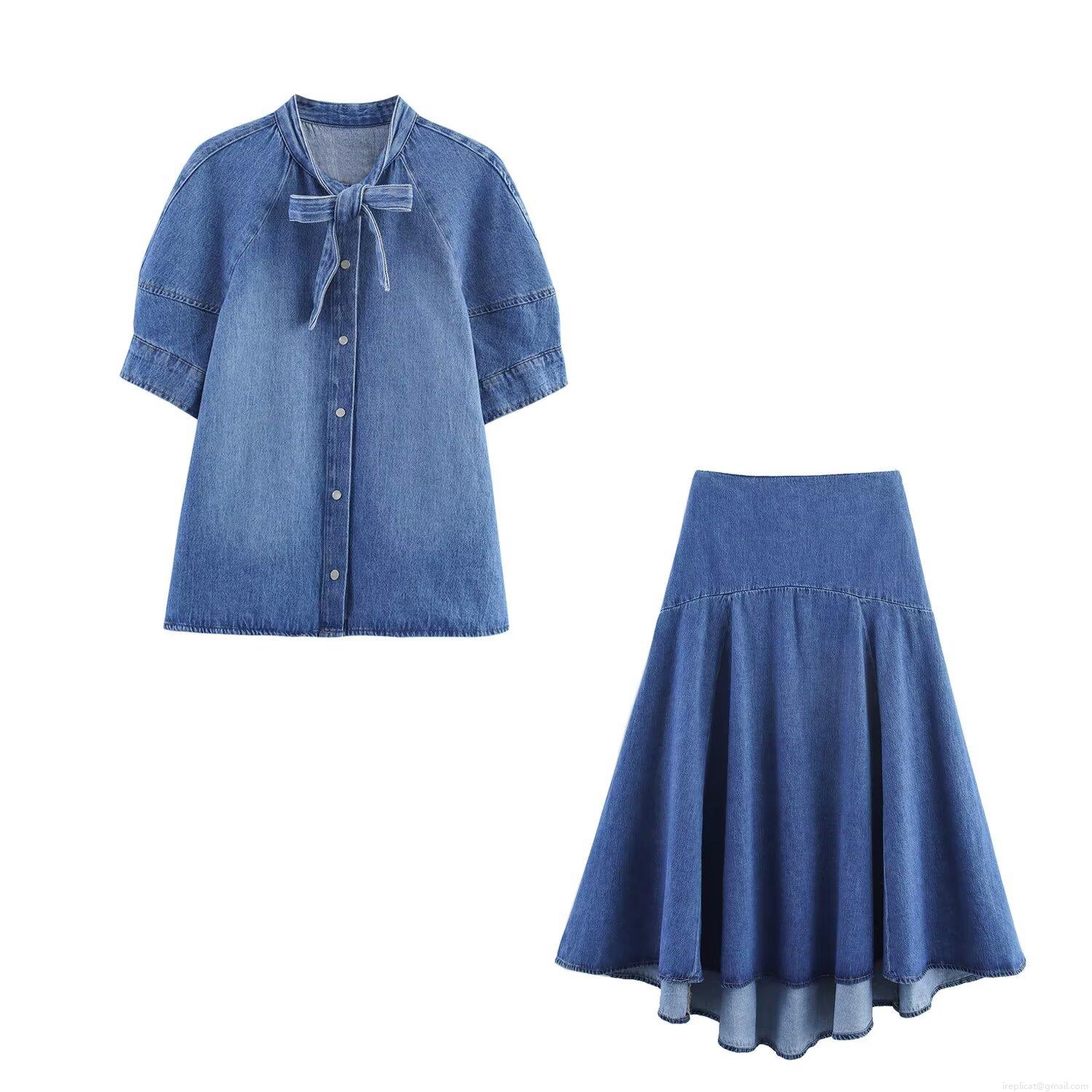 • Women's Denim Two Piece Outfits Set Bow Knot Tie Short Sleeve Button Up Shirt And High Waisted Flare A-Line Pleated Midi Skirt Casual Streetwear Outfits