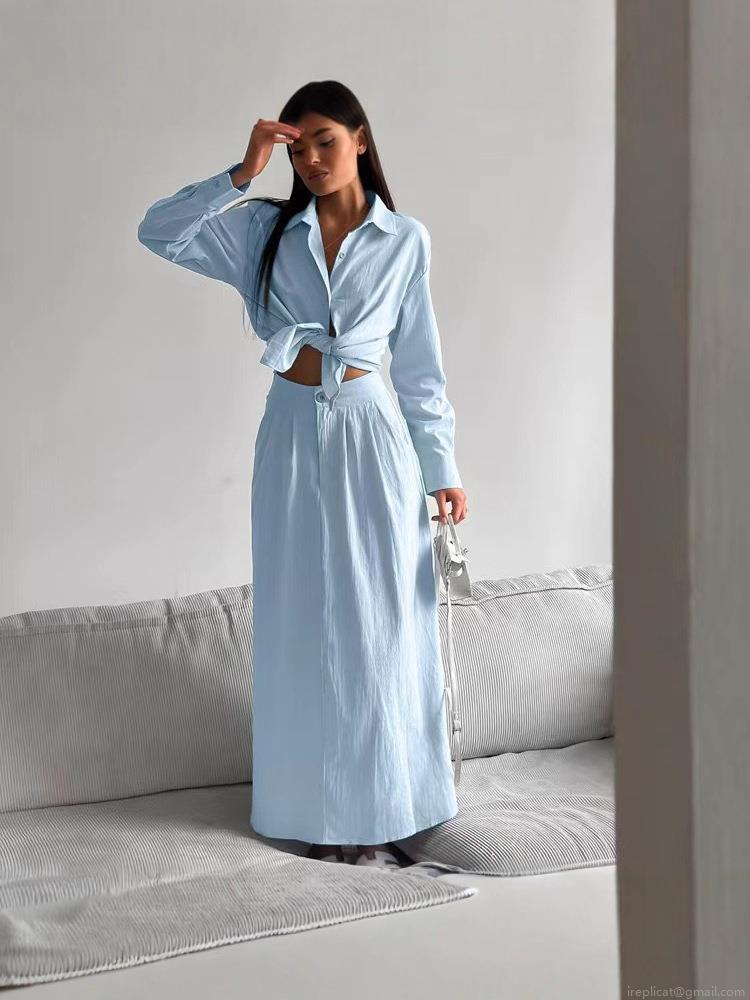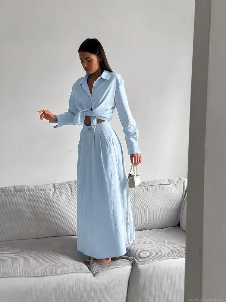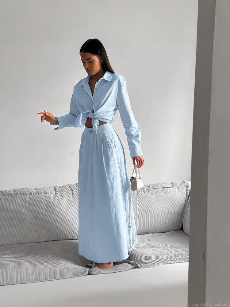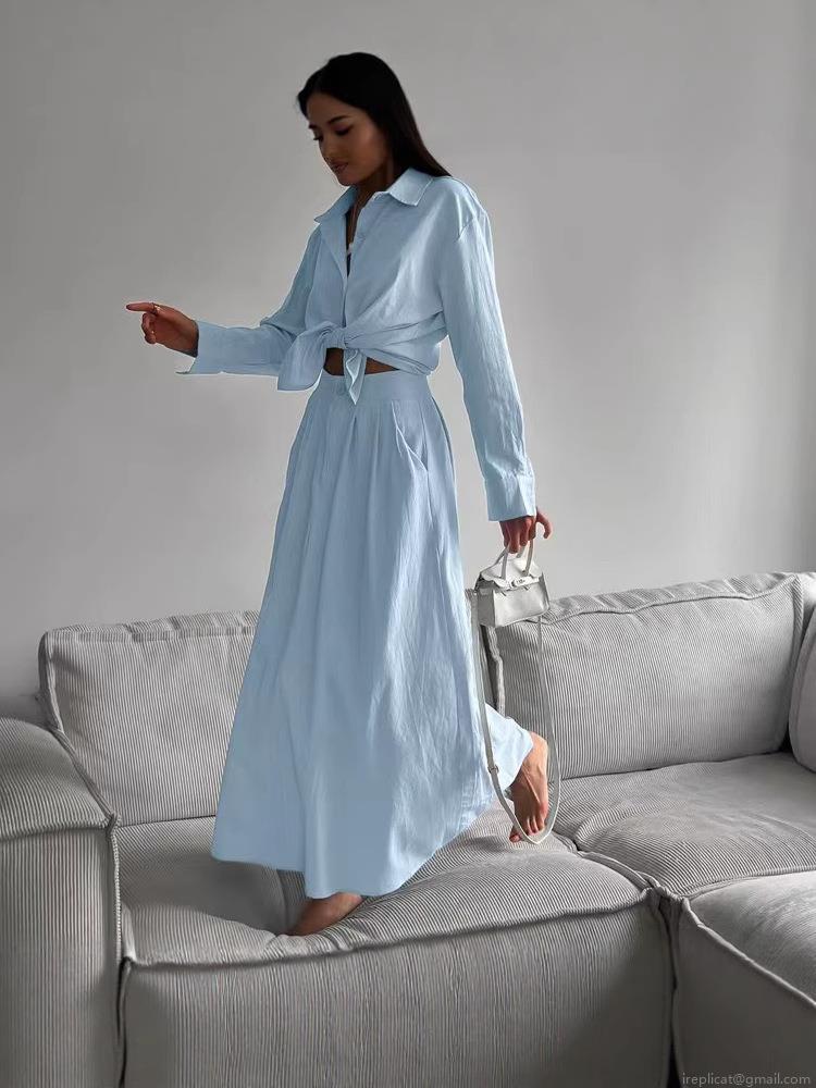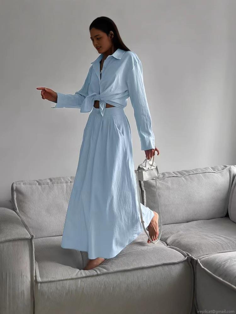 • Women's Elegant 2 Piece Skirt Set Cotton Linen Texture Polyester Long Sleeve Tie Front Shirt and High Waist Maxi Skirt Casual Commuter Outfit for Women
