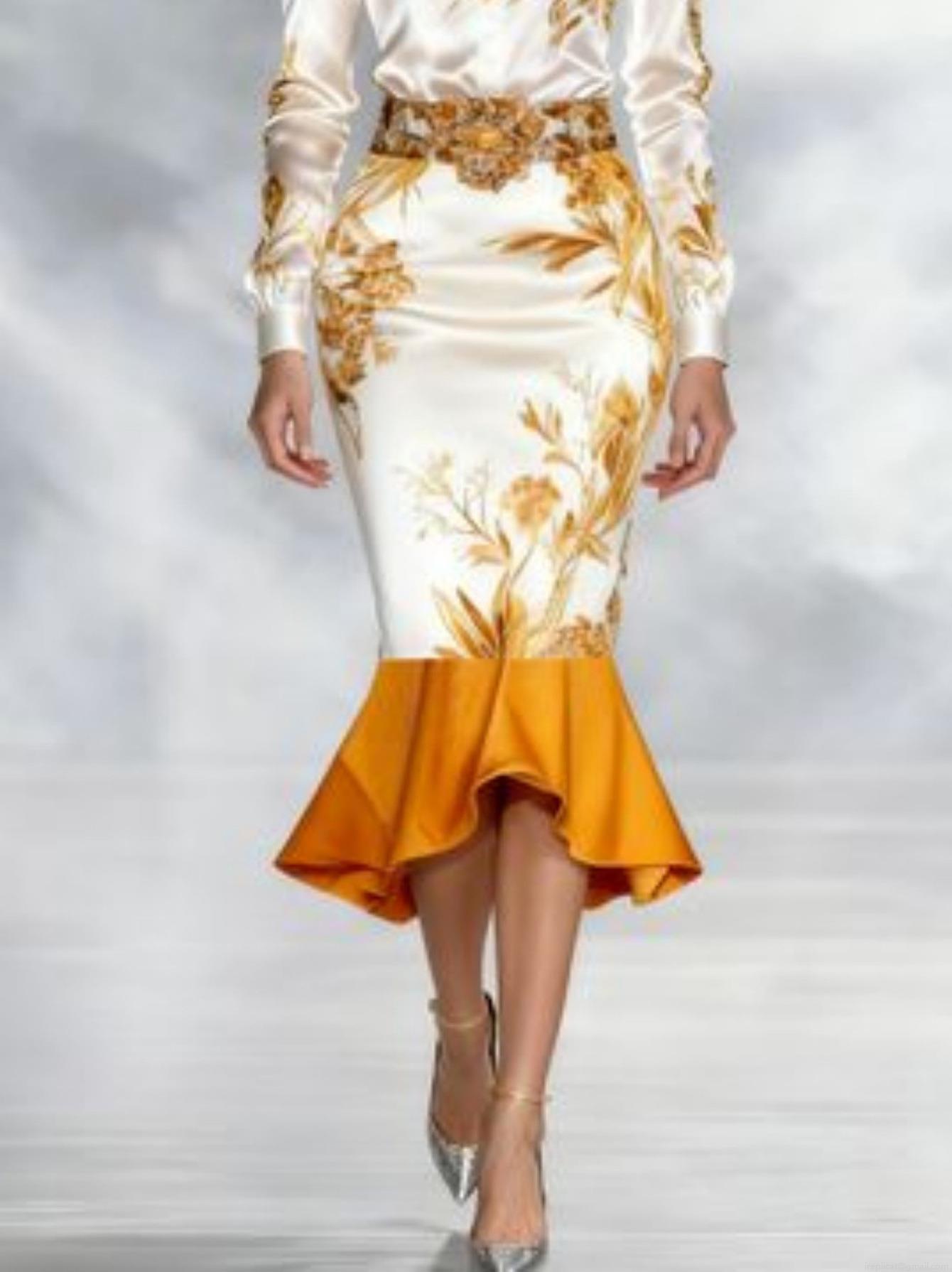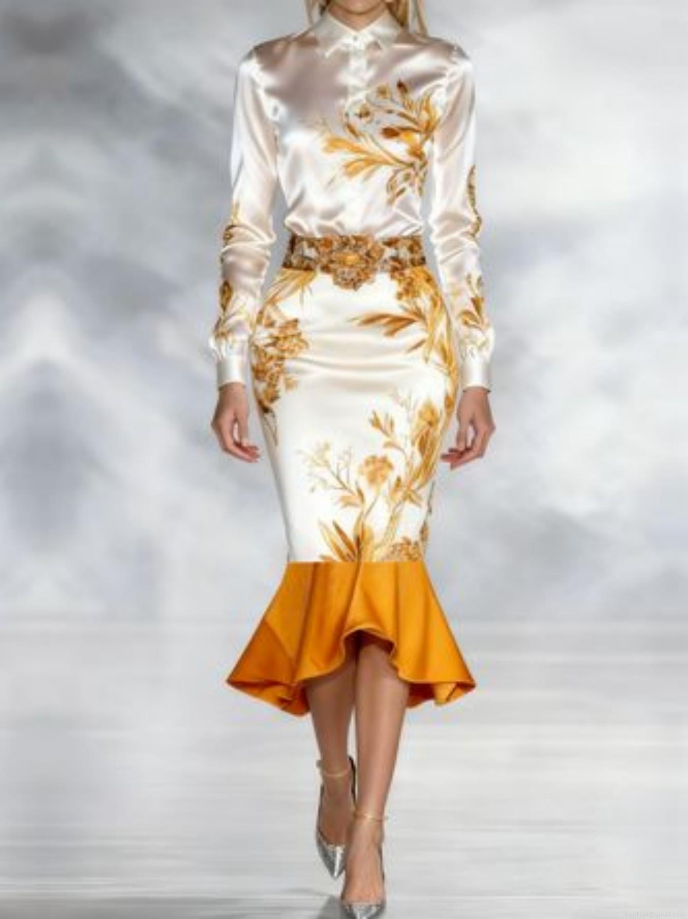 • Women's Elegant 2 Piece Skirt Set Floral Printed Long Sleeve Satin Shirt and High Waist Mermaid Midi Skirt Professional Office Lady Commuting Outfit