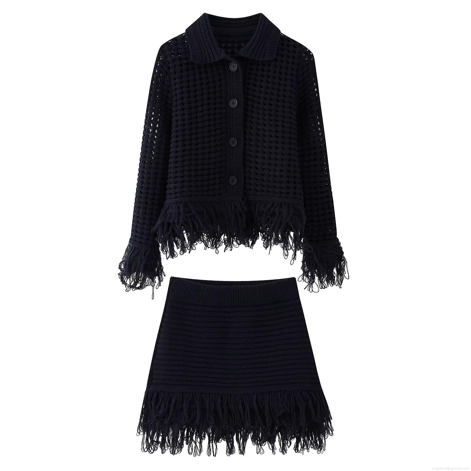 • Women's Elegant Black Knit Skirt Set Hollow Out Long Sleeve Cardigan With Fringe Mini Skirt Two Piece Outfits For Daily Commute Spring Fashion