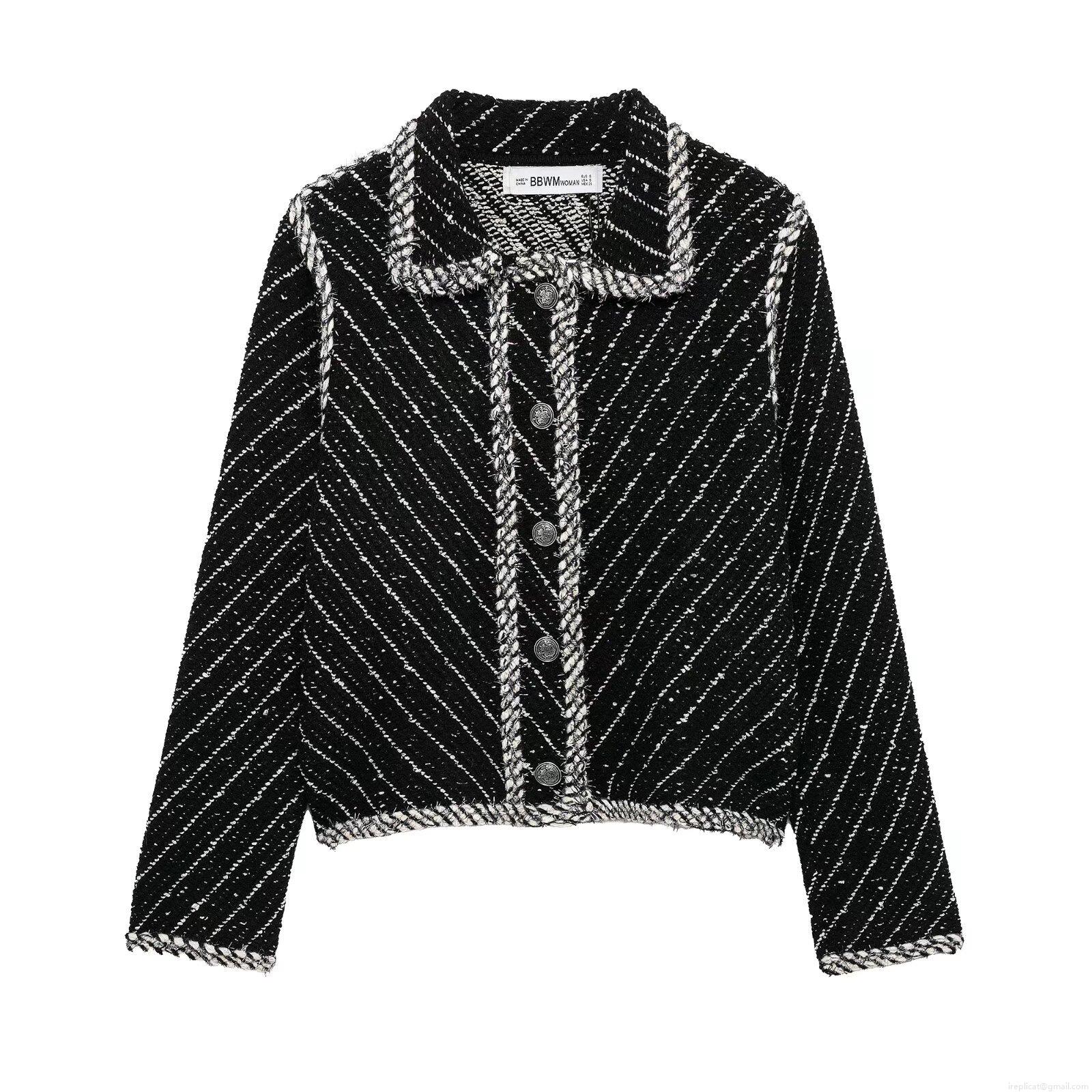 Women's Elegant Knit Tweed Two Piece Set Long Sleeve Lapel Jacket And Mini Skirt With White Diagonal Stripes Silver Buttons Street Fashion Spring Outfits