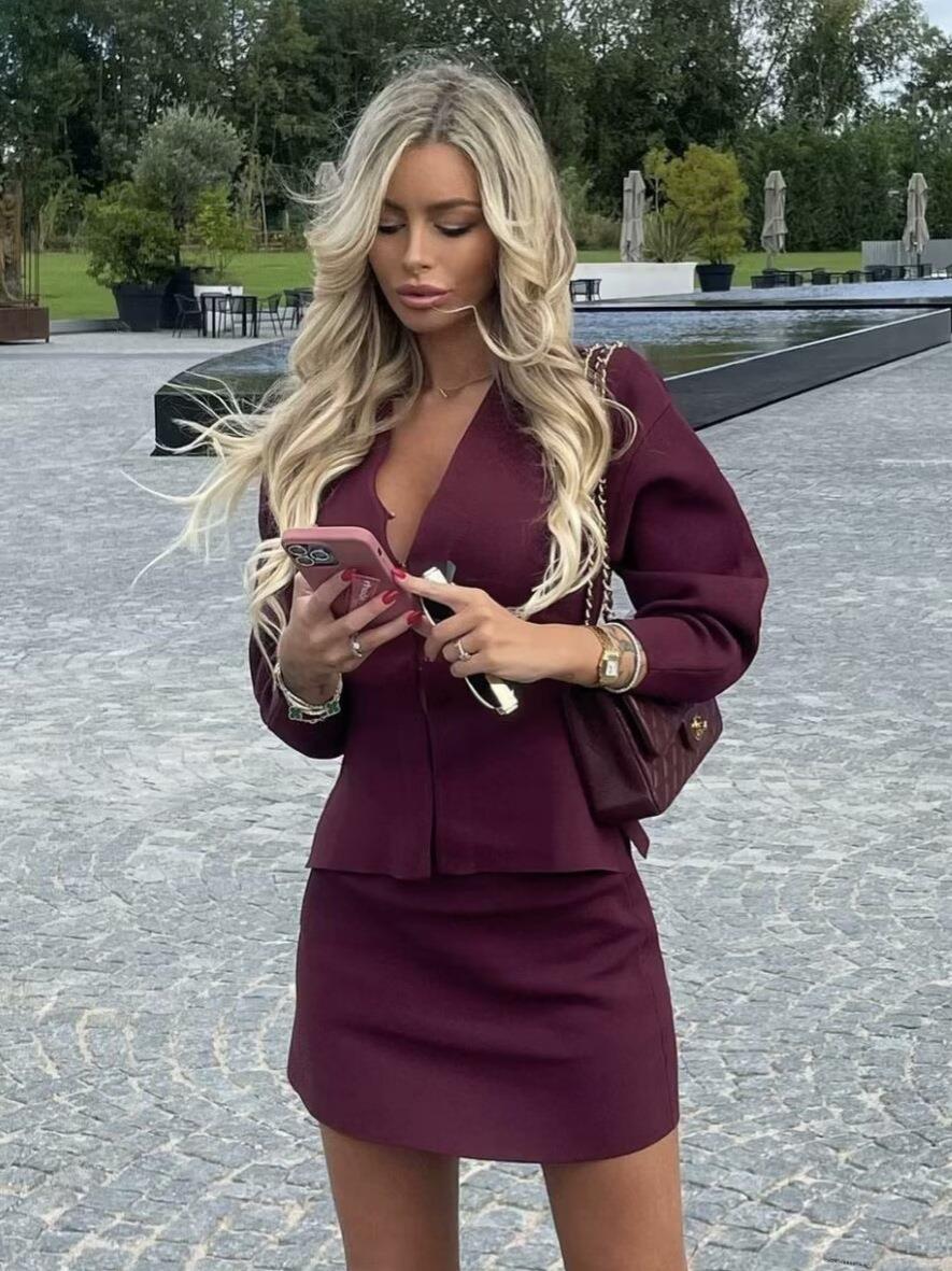 • Women's Elegant Knitted Two Piece Set Long Sleeve V Neck Peplum Top And High Waist Bodycon Mini Skirt Suit Solid Color Wine Red Streetwear Outfits For Social Party