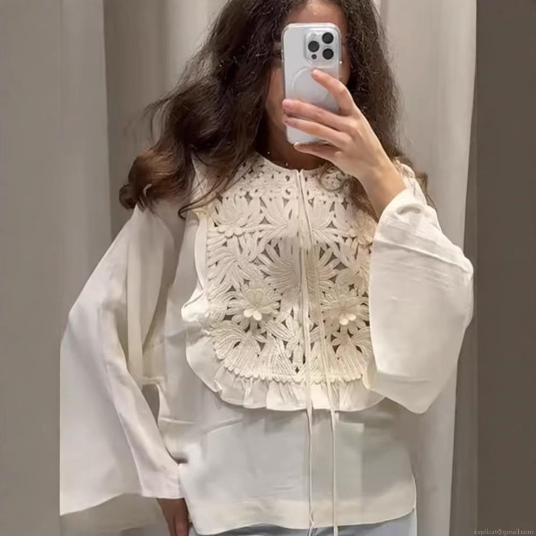 Hollow Out, Flowers, Hollow Out Splicing, Bell Sleeves, Embroidered Flowers, Collar Tie