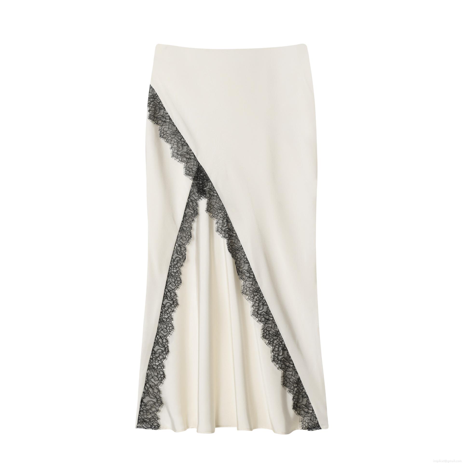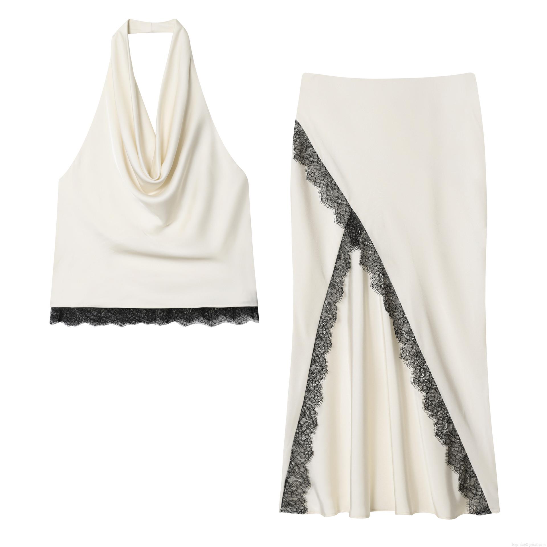 • Women's Elegant Satin Acetate Linen Two Piece Set Halter Neck Backless Crop Top And High Slit Midi Skirt With Black Lace Trim Chic Party Club Outfits