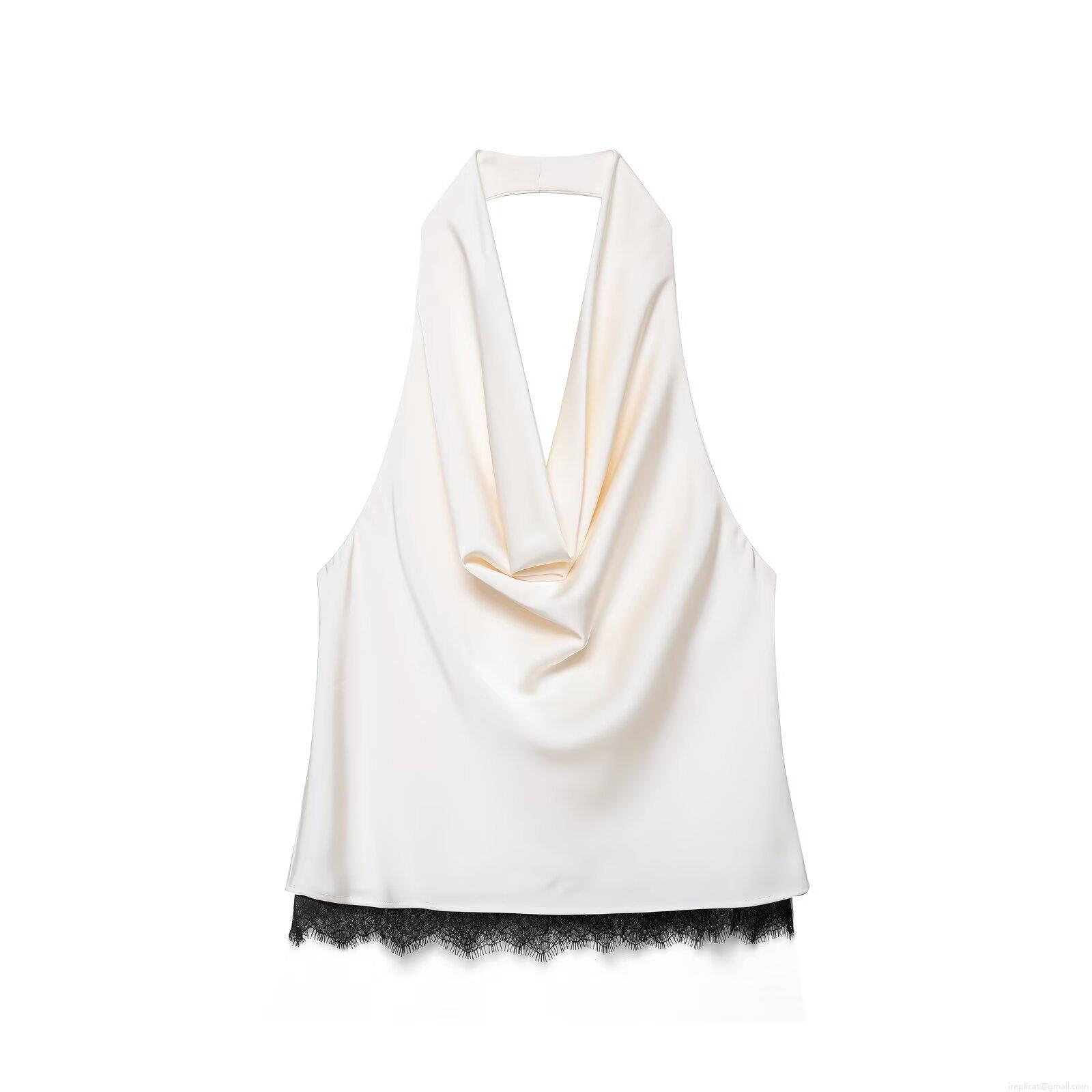 Solid Color, Splice, Neckband, Lace Trim, Backless, Dangling, Asymmetrical Cut