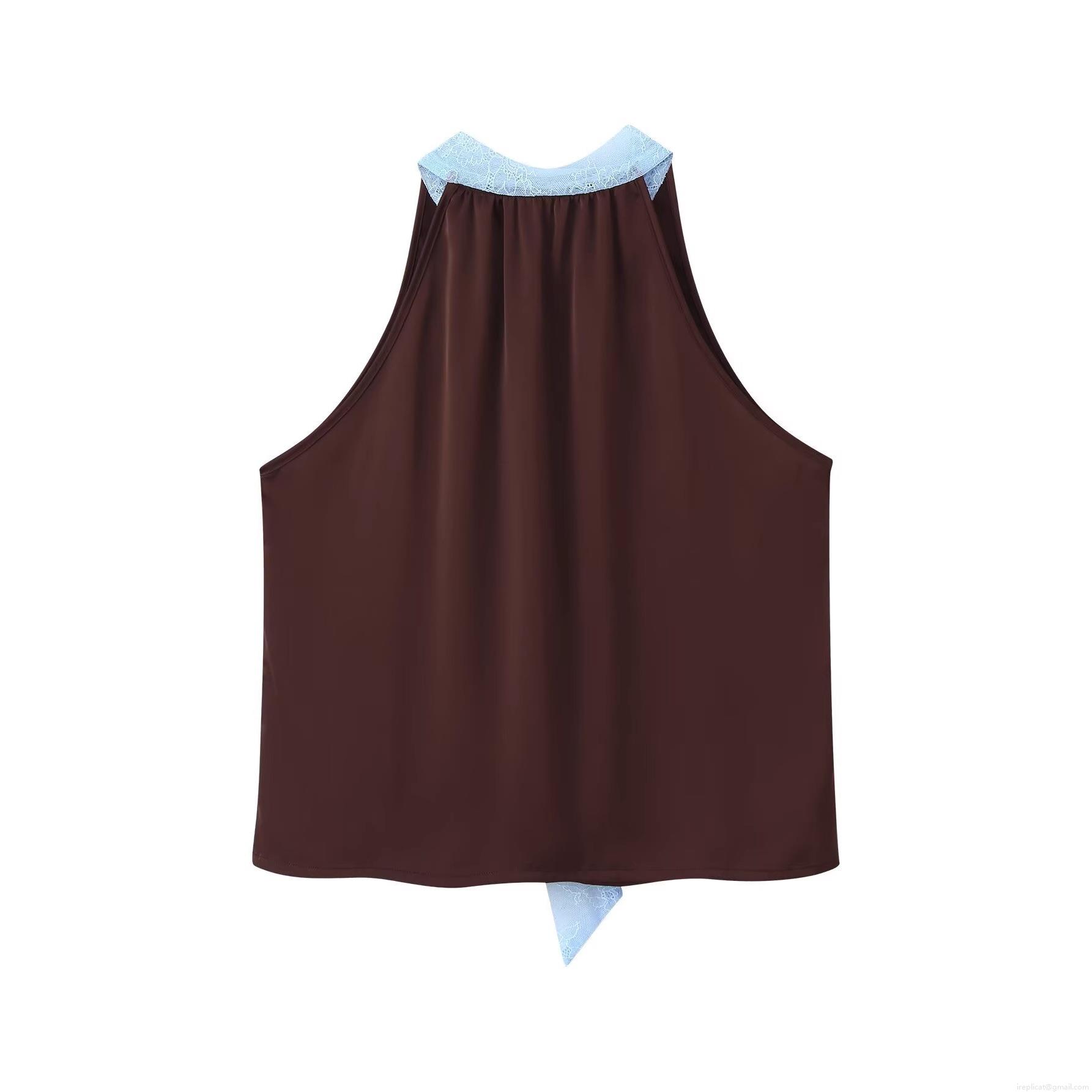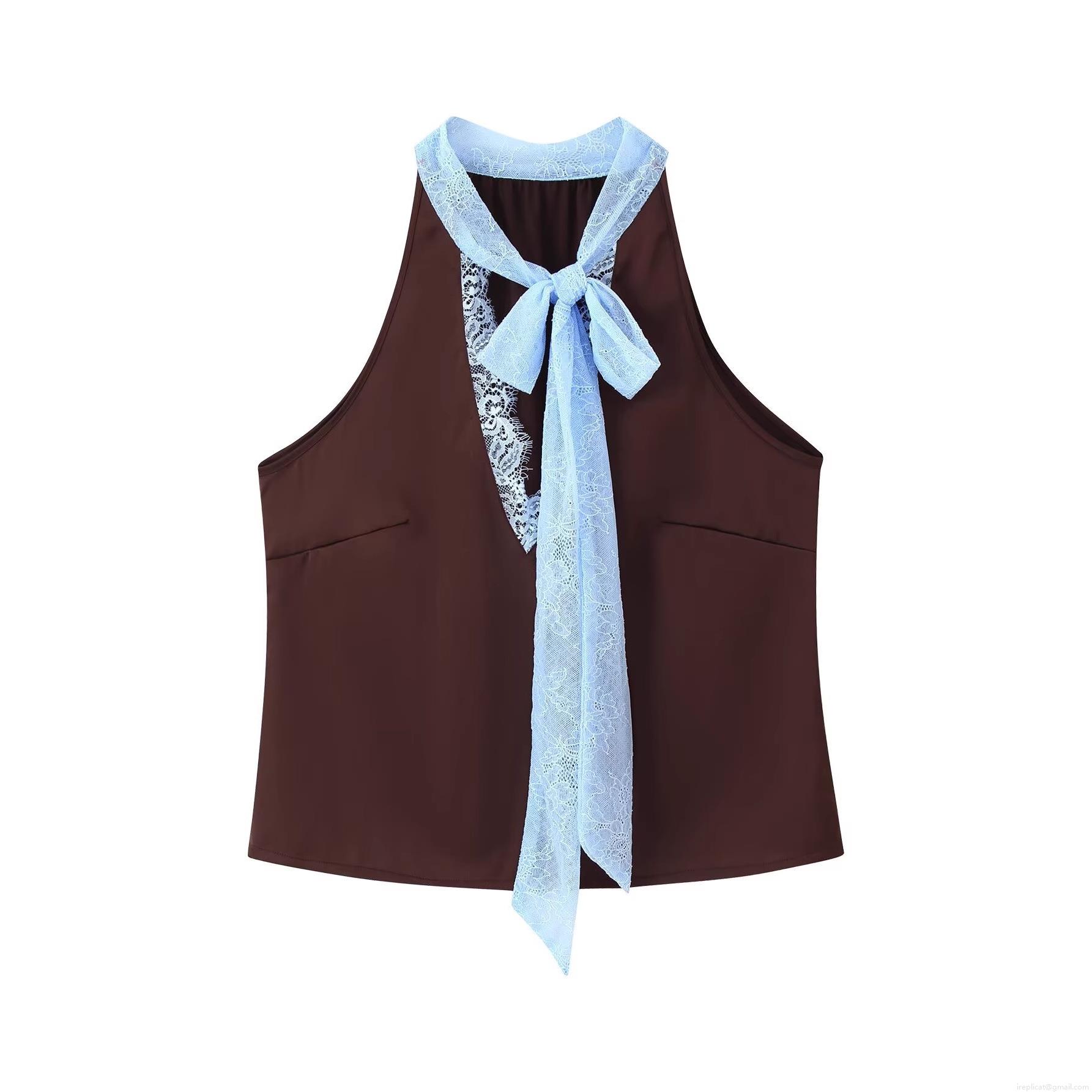 • Women's Elegant Satin Halter Neck Top and Lace Patchwork Midi Skirt Two Piece Set Contrast Color Sleeveless Bow Tie Slim Fit Co-ord Outfits