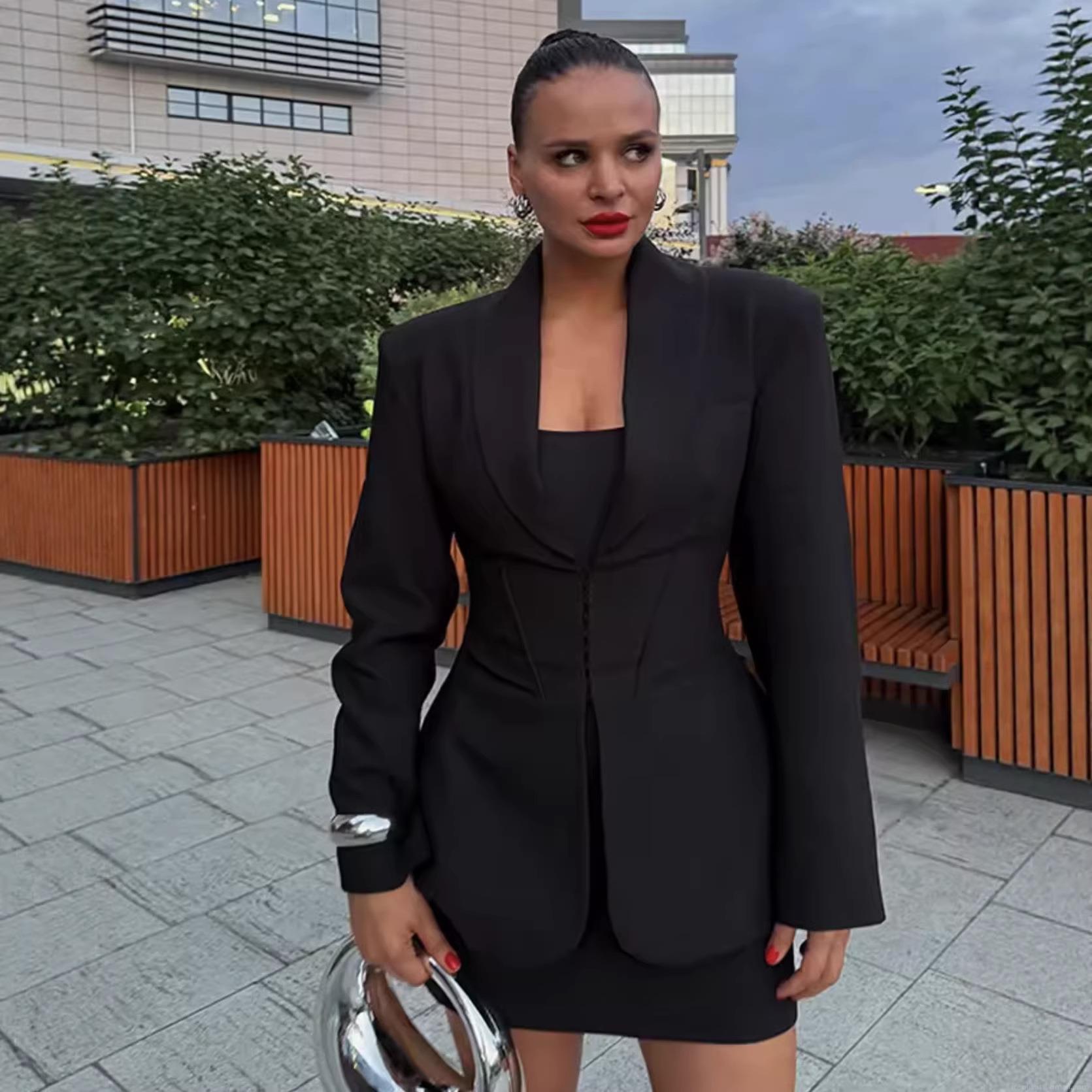 • Women's Elegant Slim Fit Blazer and Mini Skirt Set Long Sleeve V-Neck Waist Cinching Structured Shoulder Two Piece Suit for Commuter Office Party Fashion Outfit Solid Color Polyester Co-ord