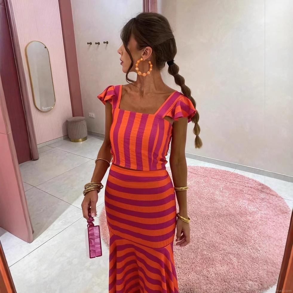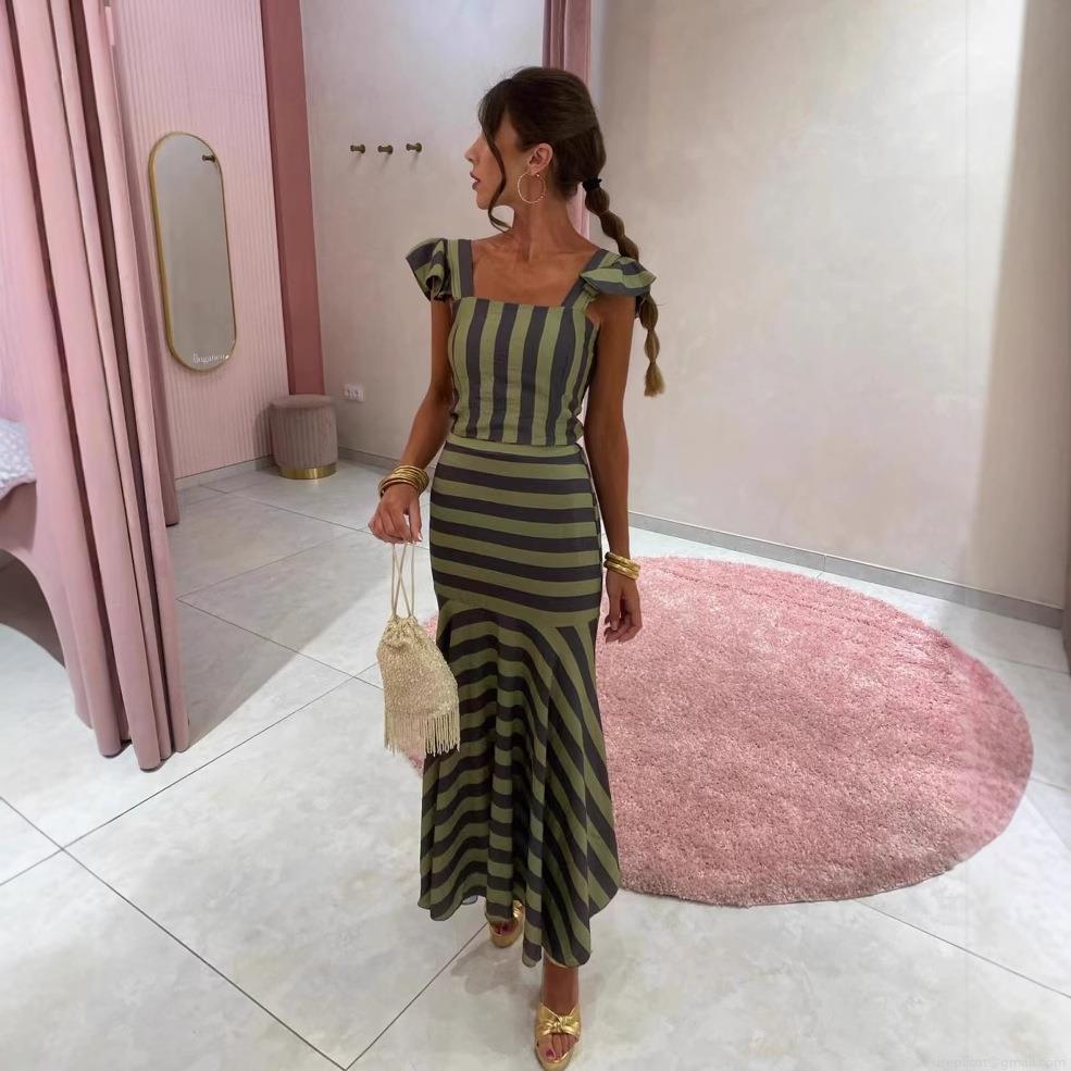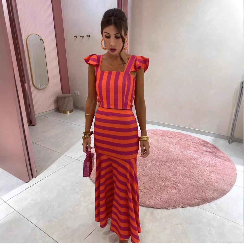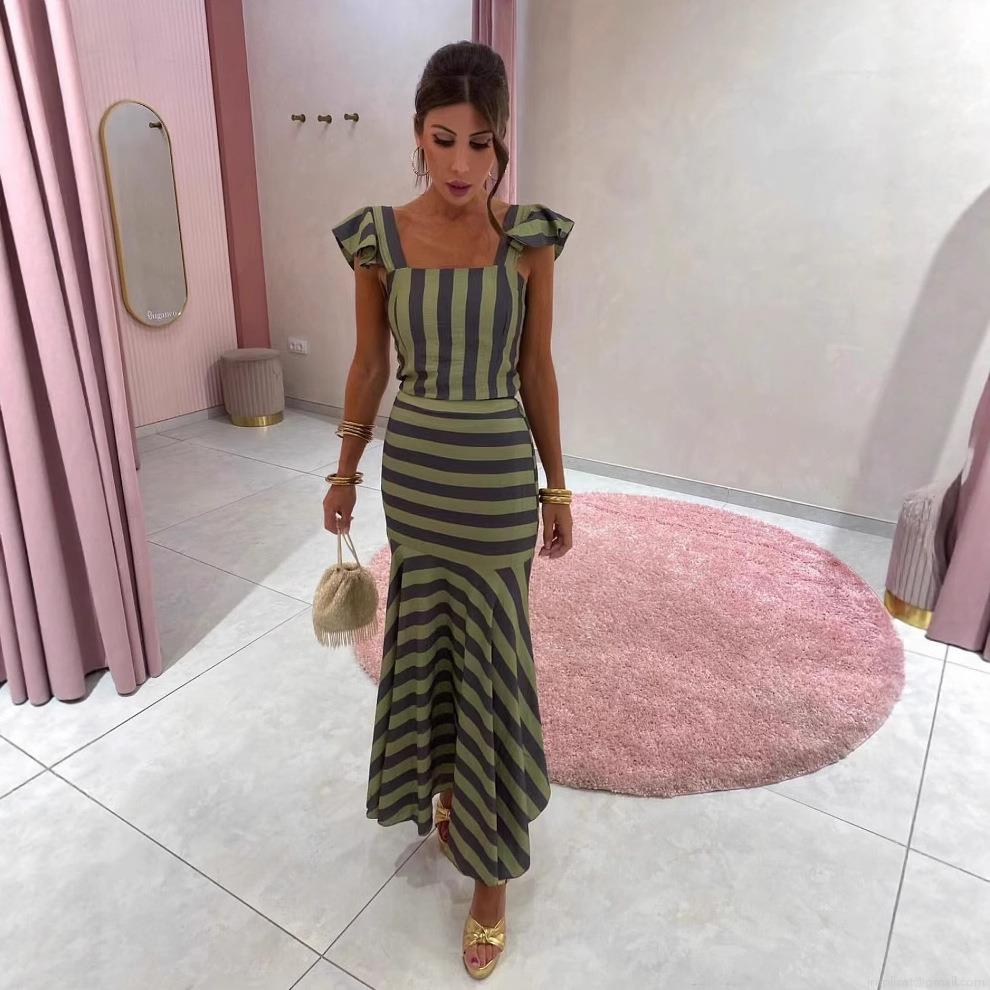 • Women's Elegant Stripe Two-Piece Skirt Set Ruffle Shoulder Crop Top And High Waist Mermaid Maxi Skirt Polyester Blend Slim Fit Summer Vacation Outfit