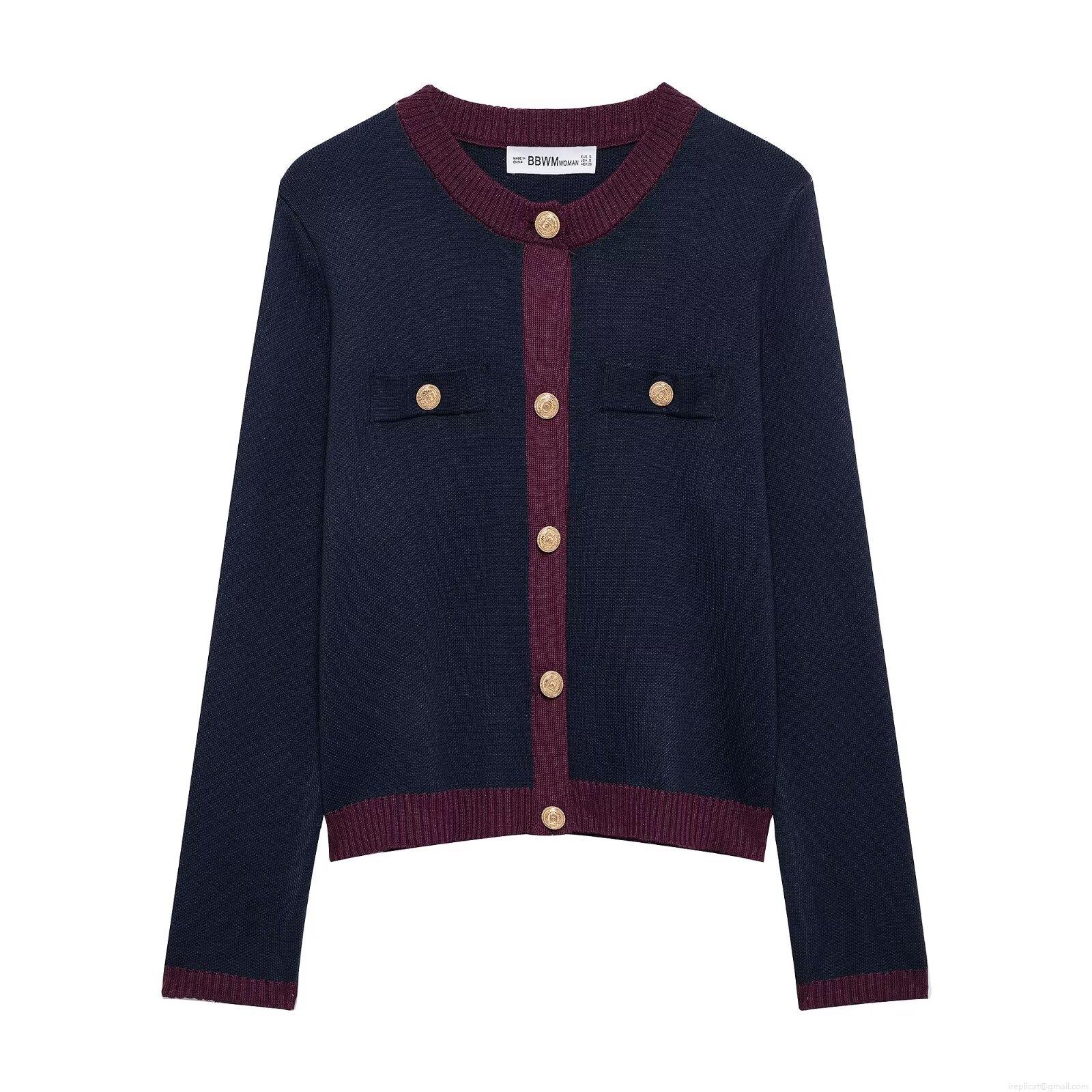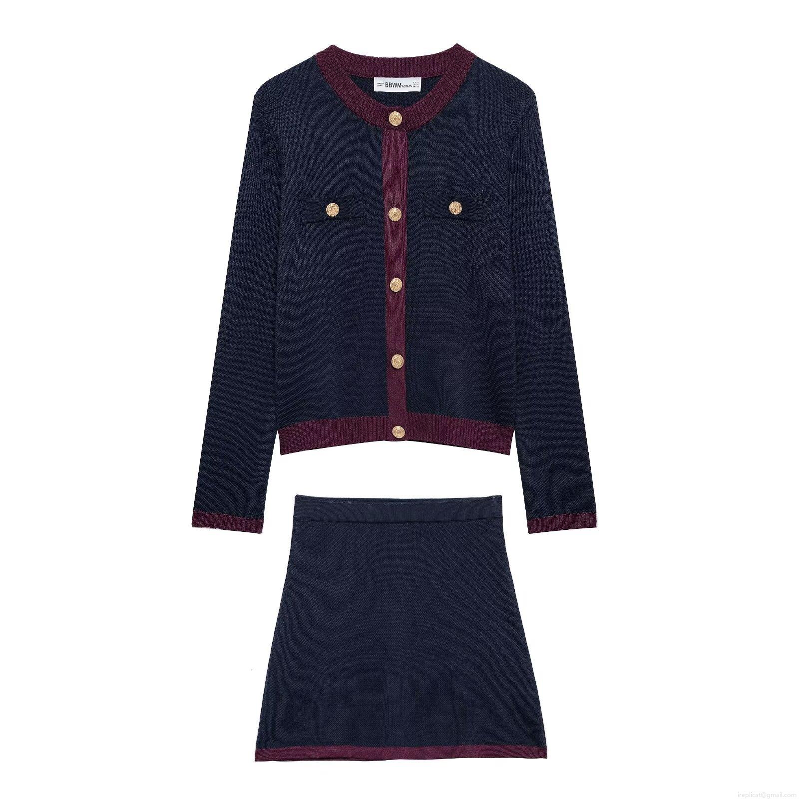 Women's Fashion Contrast Trim Knit Two Piece Set Long Sleeve Gold Button Cardigan Jacket And Matching Mini Skirt Casual Streetwear Knitted Outfit