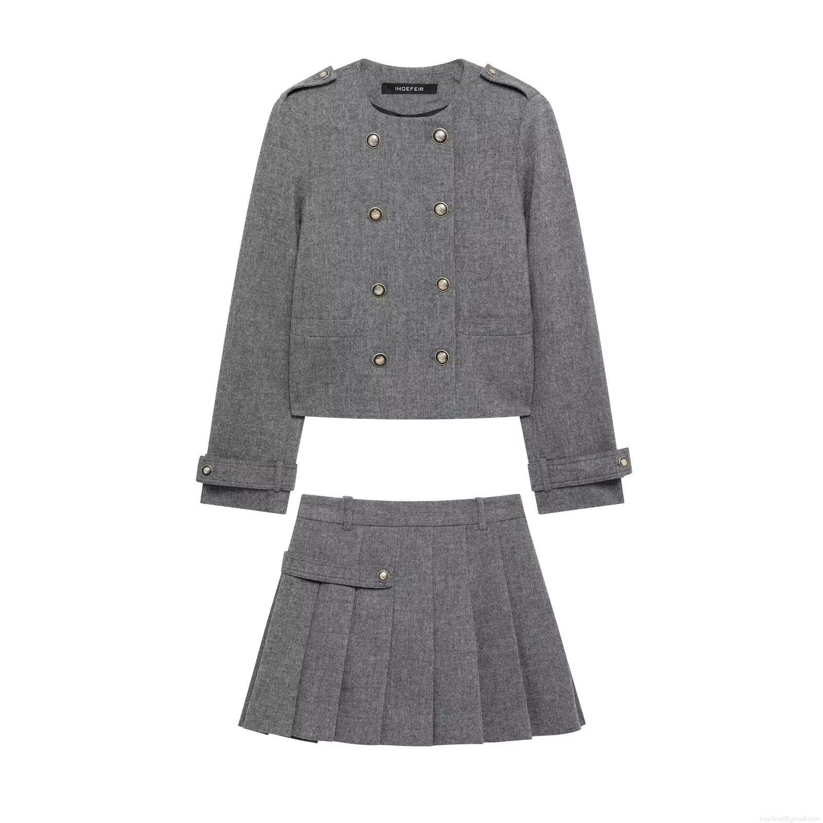 • Women's Fashion Grey Double Breasted Long Sleeve Jacket And Pleated Mini Skirt Set Polyester Blend Streetwear Academy Style Casual Two Piece Outfit For Women