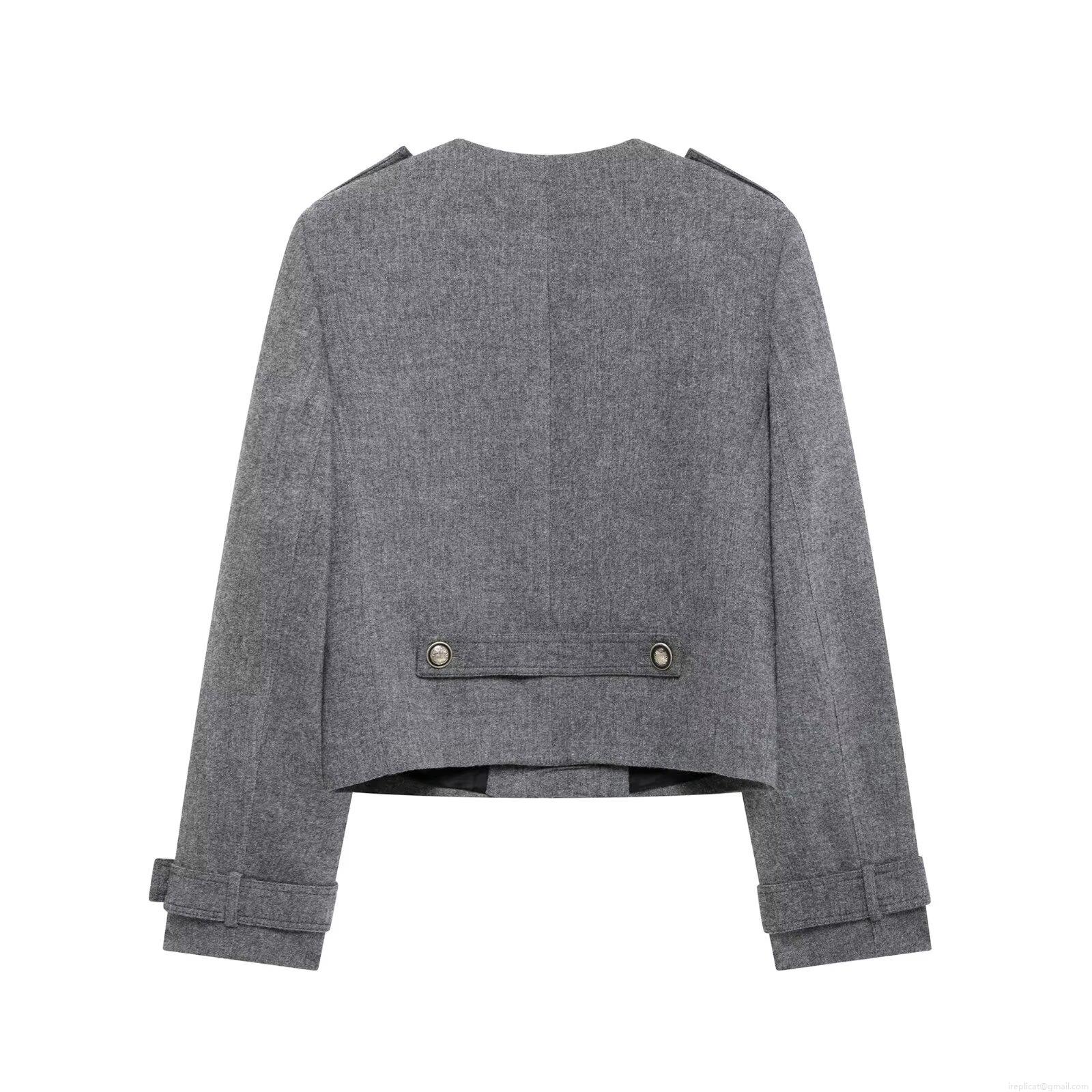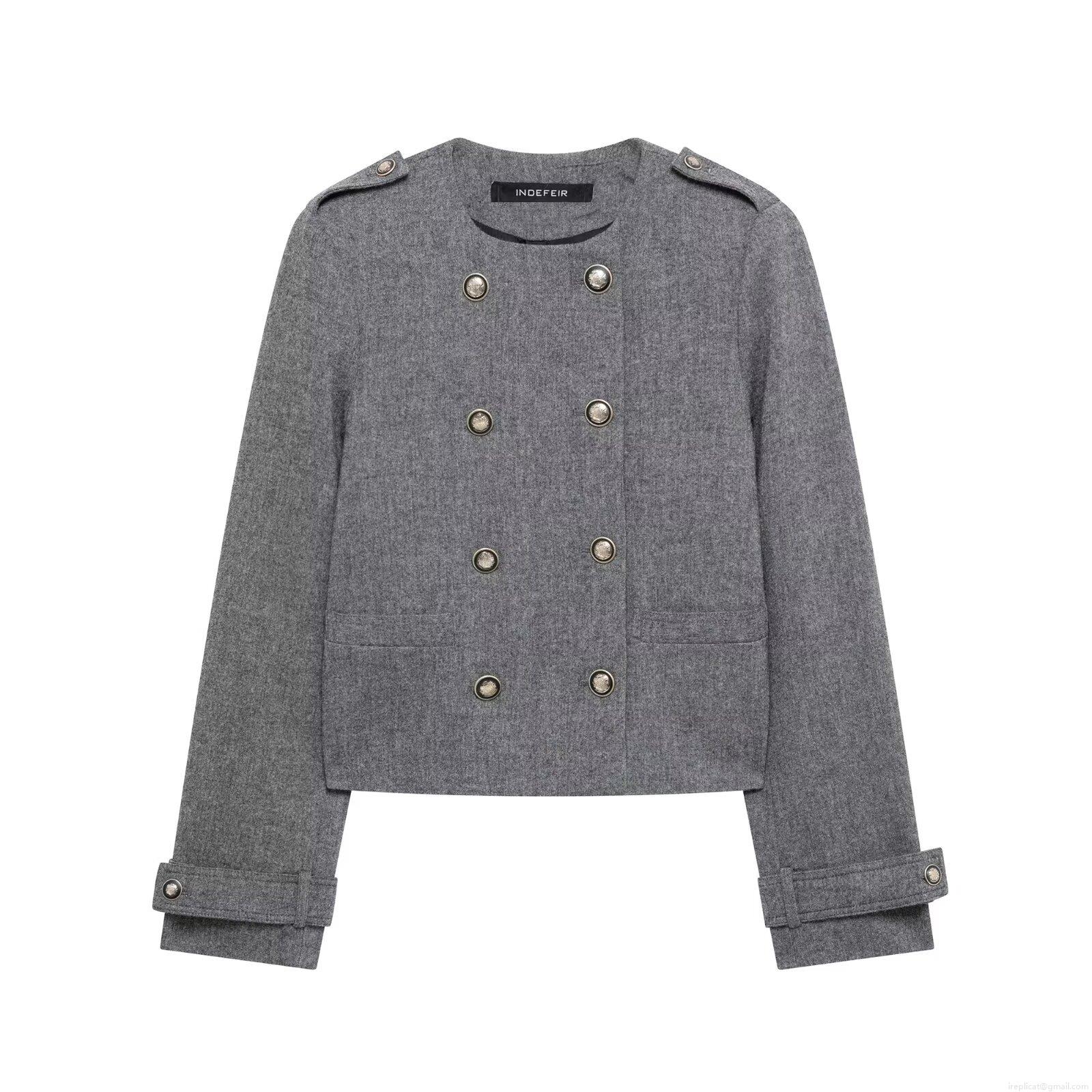 Women's Fashion Grey Double Breasted Long Sleeve Jacket And Pleated Mini Skirt Set Polyester Blend Streetwear Academy Style Casual Two Piece Outfit For Women