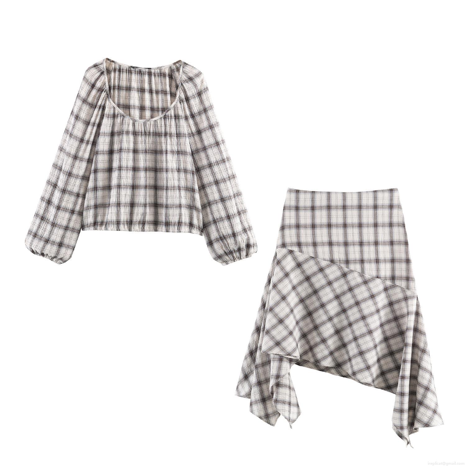 • Women's Fashion Plaid Two Piece Skirt Set Square Neck Long Sleeve Puff Top And Irregular Hem Asymmetric Mini Skirt Streetwear Outfits