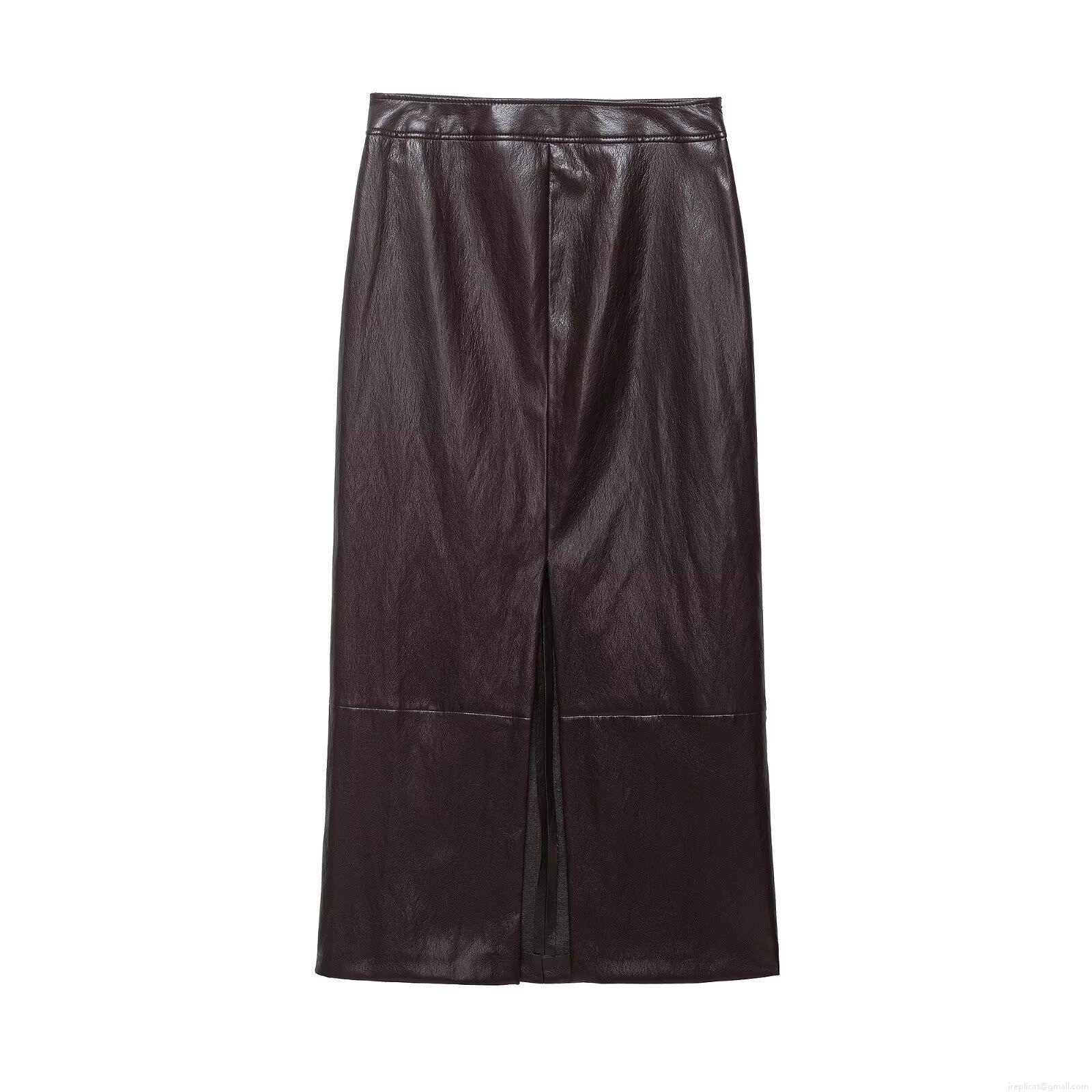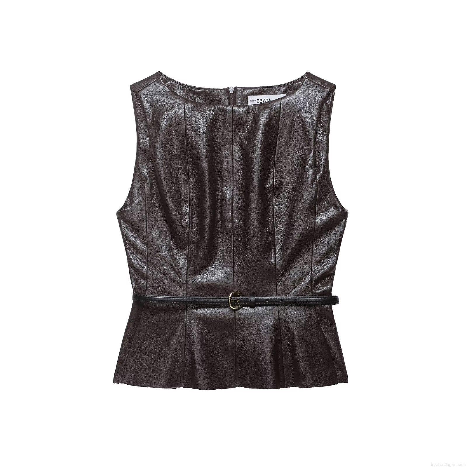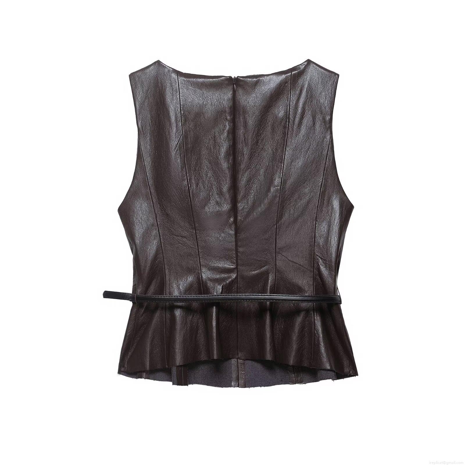 • Women's Faux Leather Top and Midi Skirt Set Chic Deep Brown Sleeveless Vest With Belt High Waist Slit Skirt Streetwear Two Piece Outfit PU Leather Suit