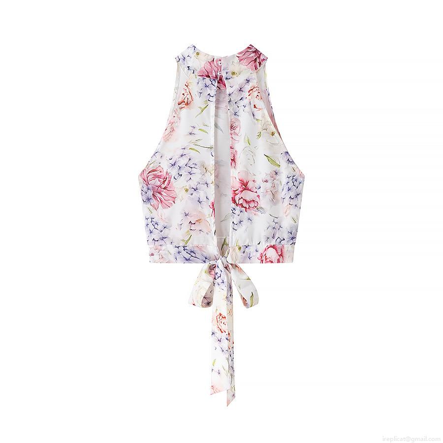 • Women's Floral Print Two Piece Set Halter Neck Backless Crop Top and Double Layered Tiered Mini Skirt Summer Beach Boho Vacation Outfit