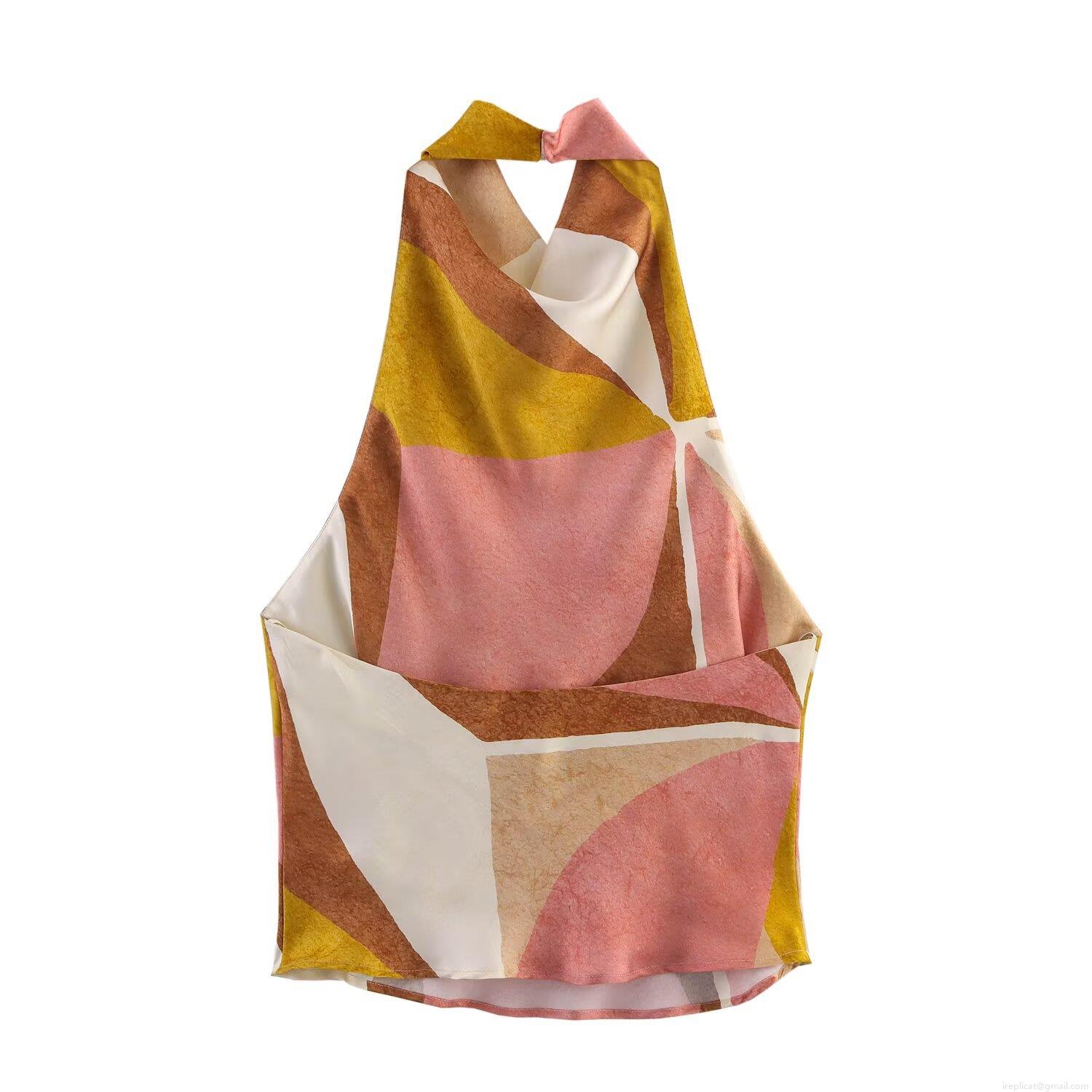 • Women's Geometric Abstract Print Halter Neck Top and Pleated Midi Skirt Two Piece Set Casual Summer Vacation Satin Skirt Suit