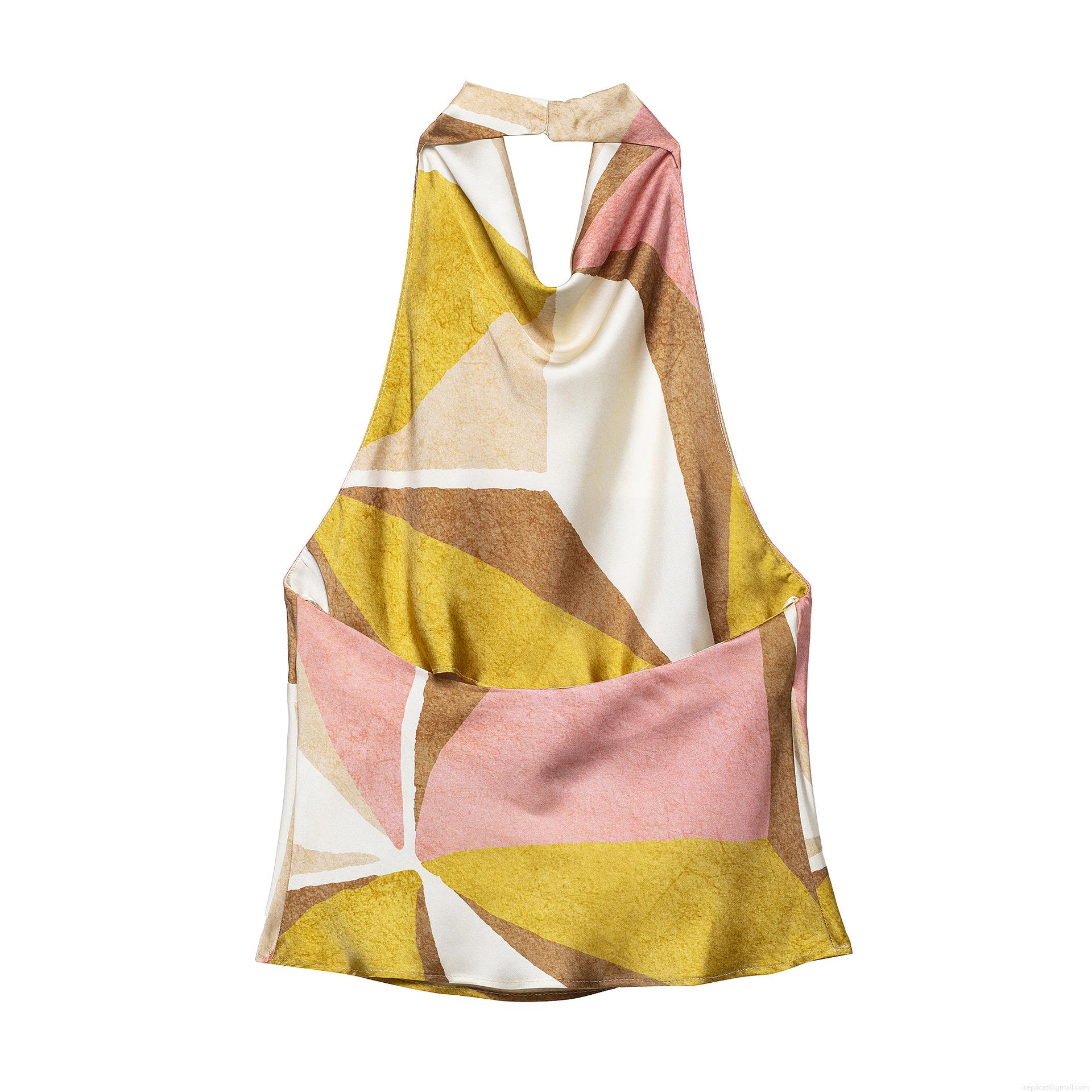 • Women's Geometric Abstract Print Two Piece Outfit Halter Backless Sleeveless Top and High Waist Pleated Midi Skirt Casual Vacation Fashion