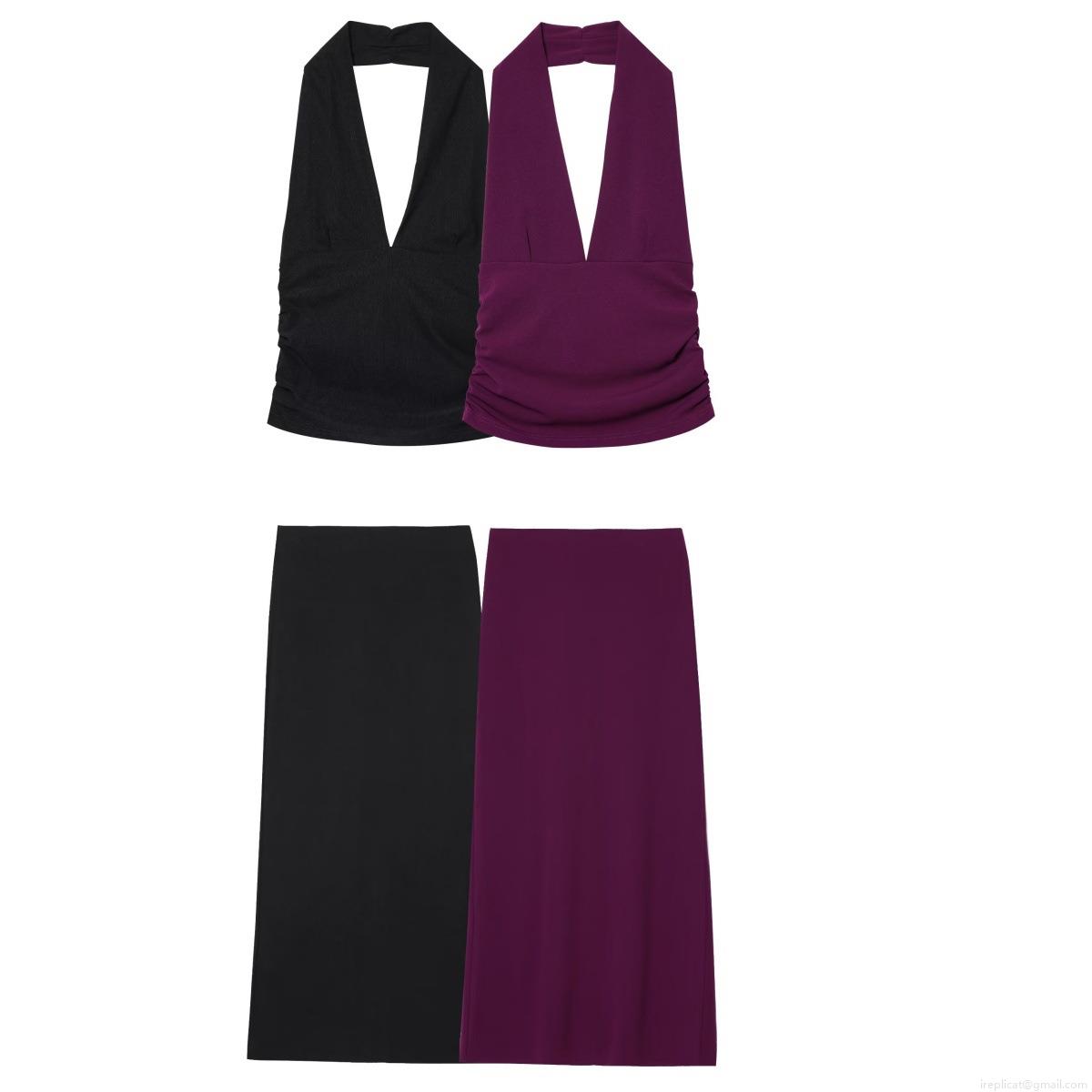 • Women's Halter Neck Deep V-Neck Ruched Top and Side Slit Long Skirt Two Piece Set Solid Color Sleeveless Slim Fit Summer Streetwear Party Outfit