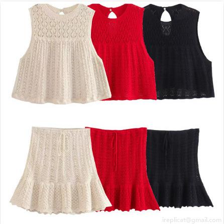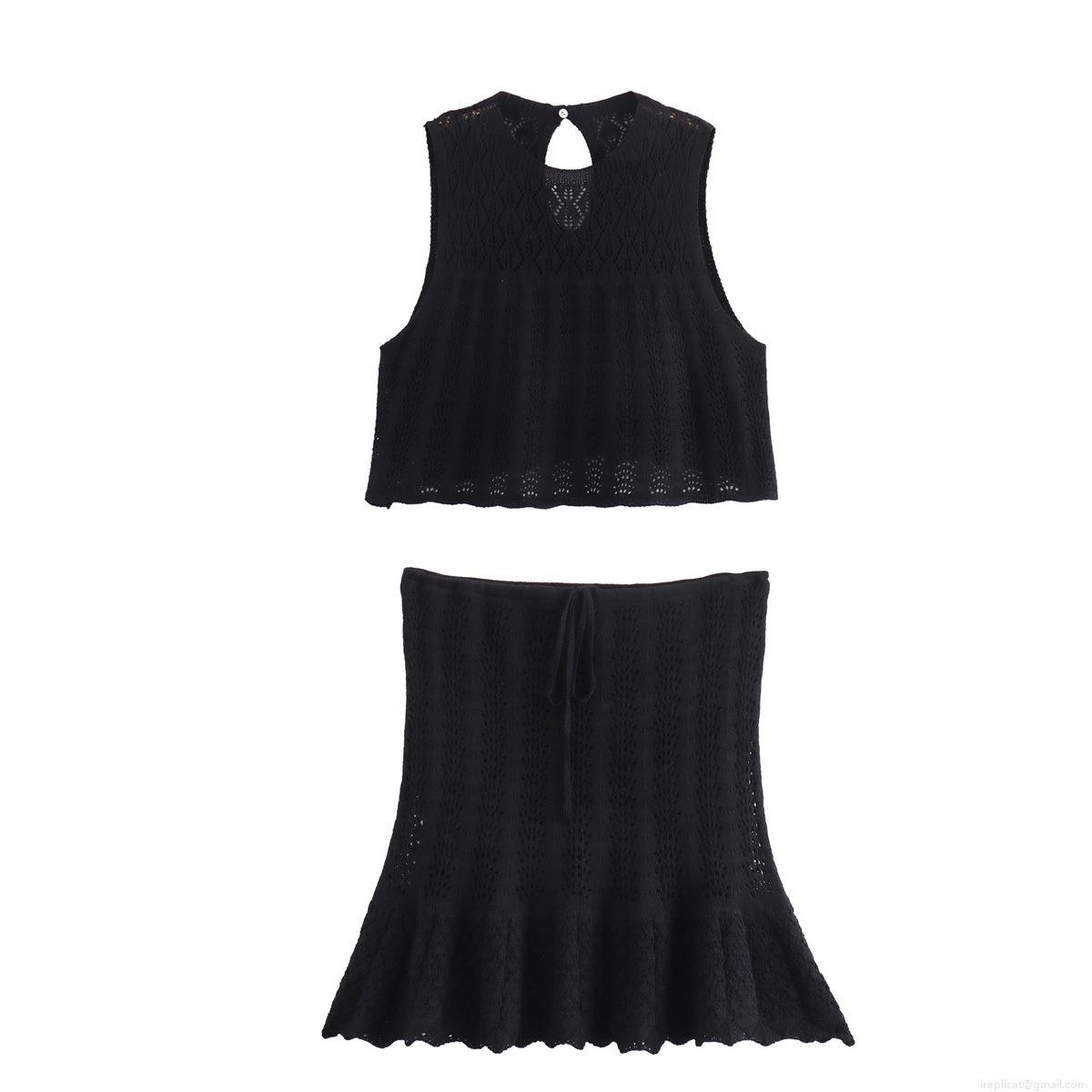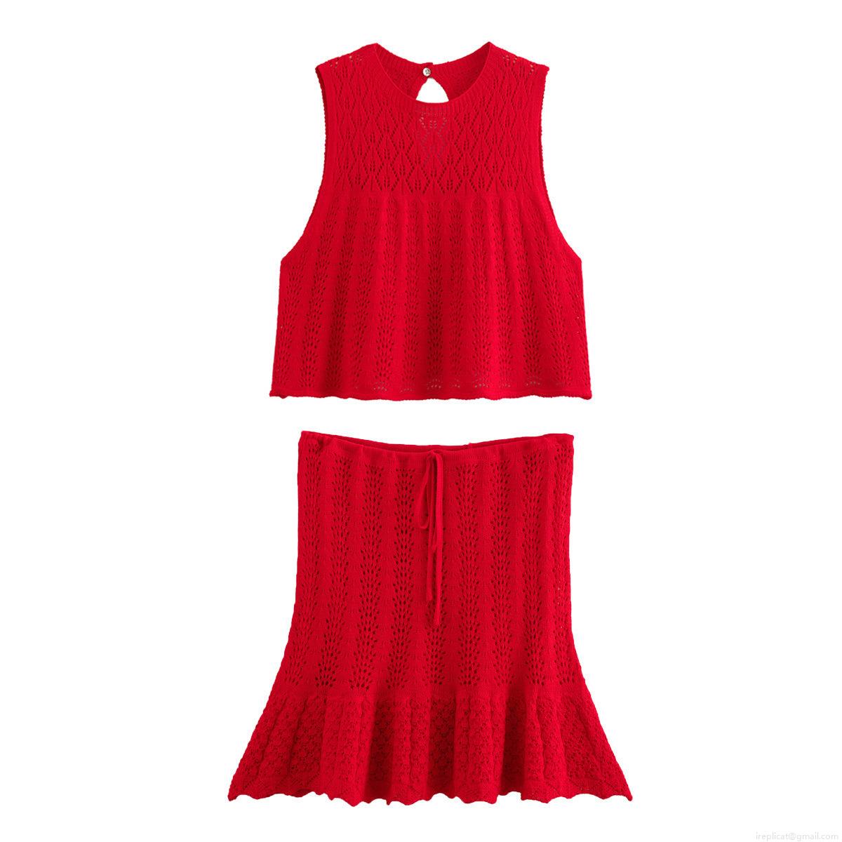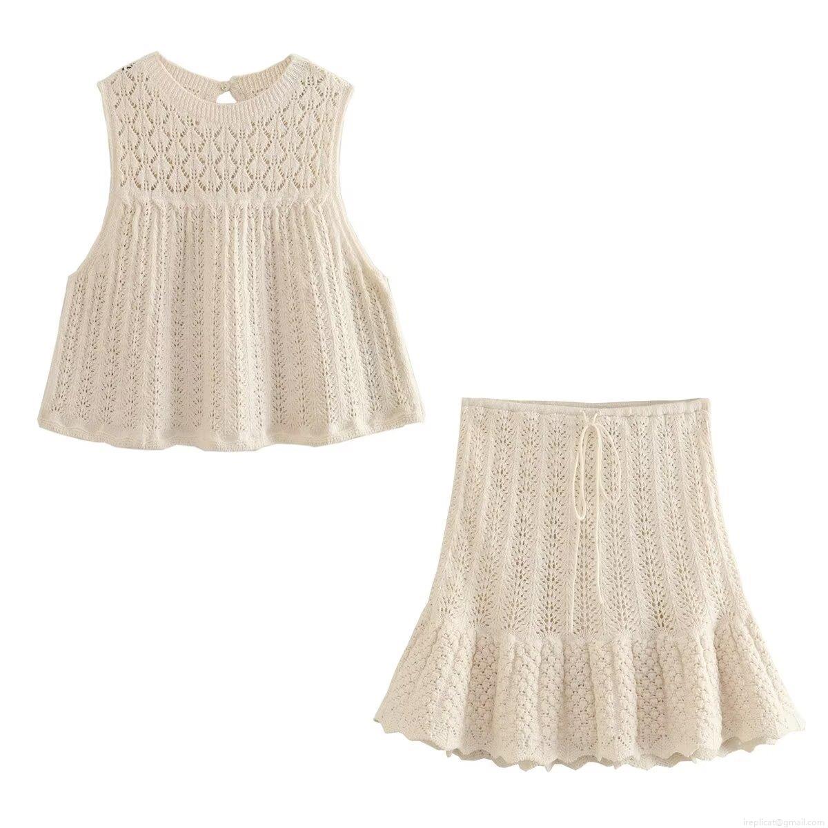 • Women's Knit Crochet Two-Piece Set Sleeveless Hollow Out Top and Ruffle Mini Skirt Solid Color Street Casual Summer Beach Outfits Women Clothing