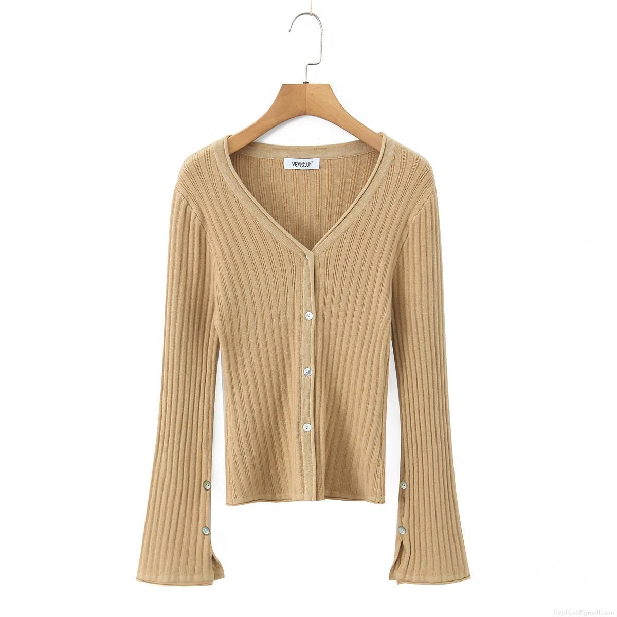 Solid Color, Pleats, Buttons, V-neck, Ribbed Knit, Rough Texture