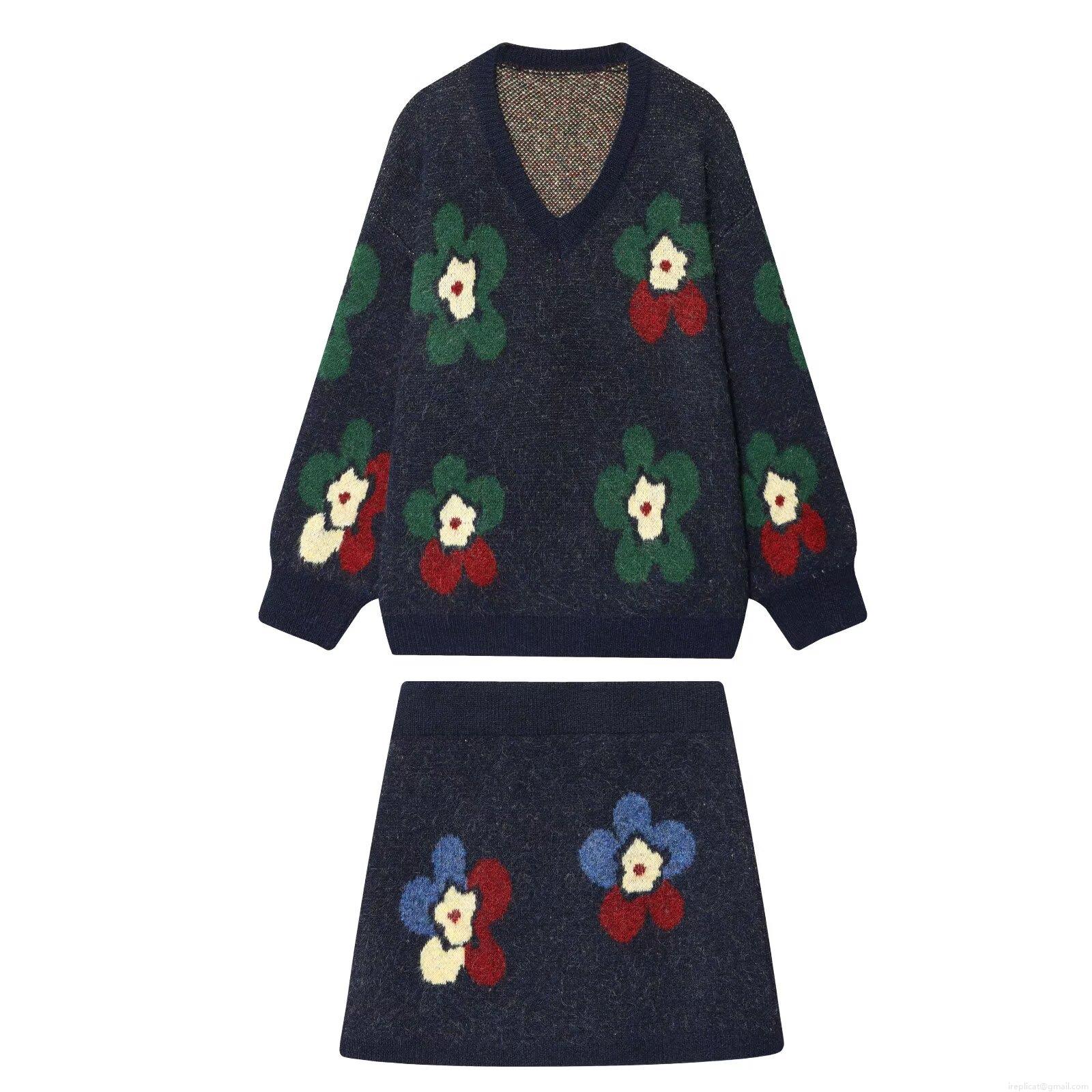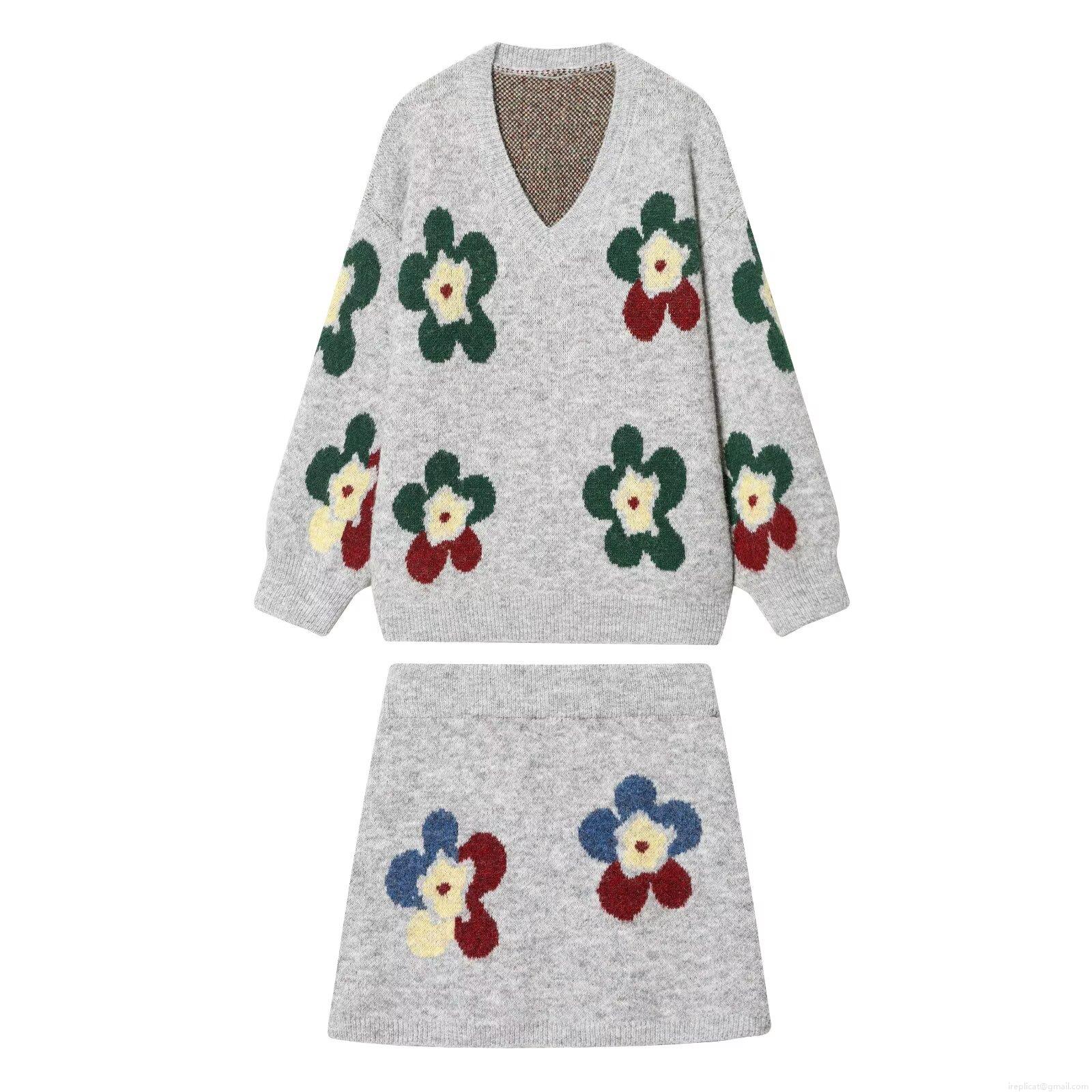 • Women's Knit Two-Piece Skirt Set Flower Jacquard V-Neck Long Sleeve Sweater And Mini Skirt Warm Cozy Casual Outfit For Women Streetwear Autumn Winter
