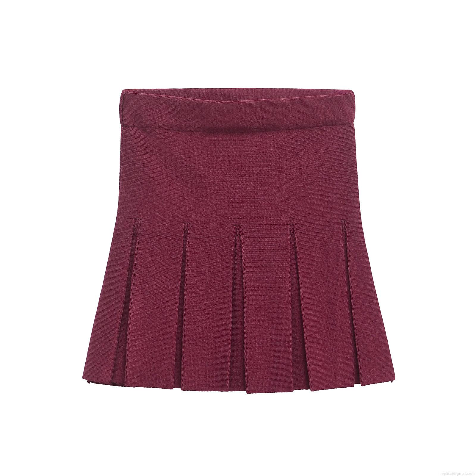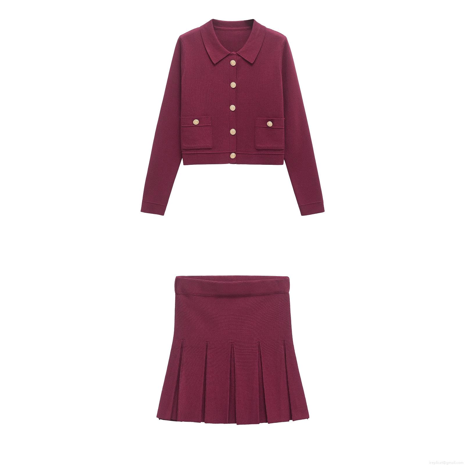 • Women's Knitted Skirt Set Wine Red Long Sleeve Cardigan And Pleated Mini Skirt Elegant Mercerized Cotton Solid Color Outfit With Gold Buttons For Party Lady