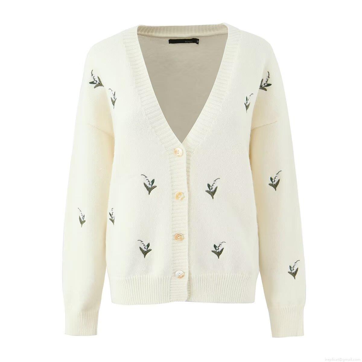 • Women's Knitted Two Piece Set Elegant Lily Of The Valley Embroidery V Neck Cardigan And High Waist Long Skirt Autumn Casual Knitwear Outfits