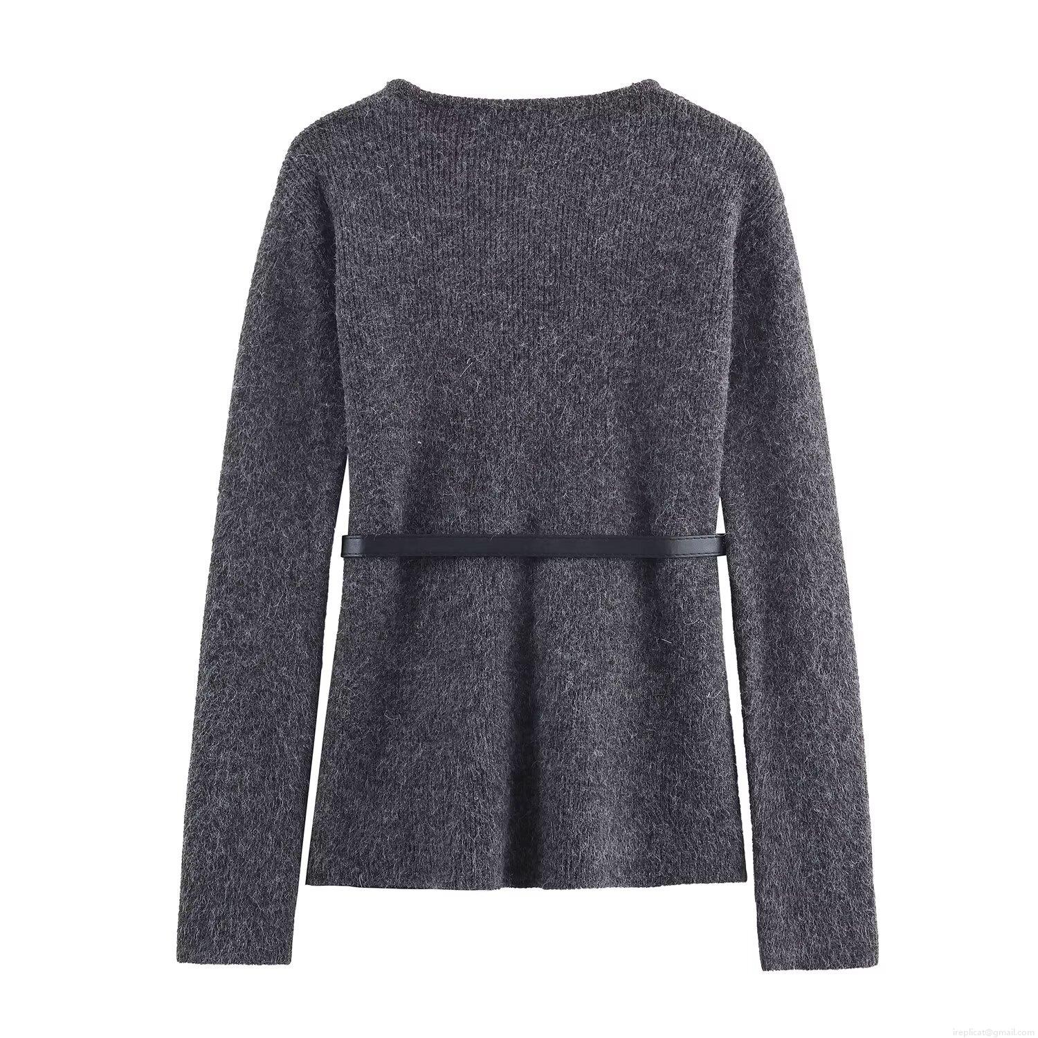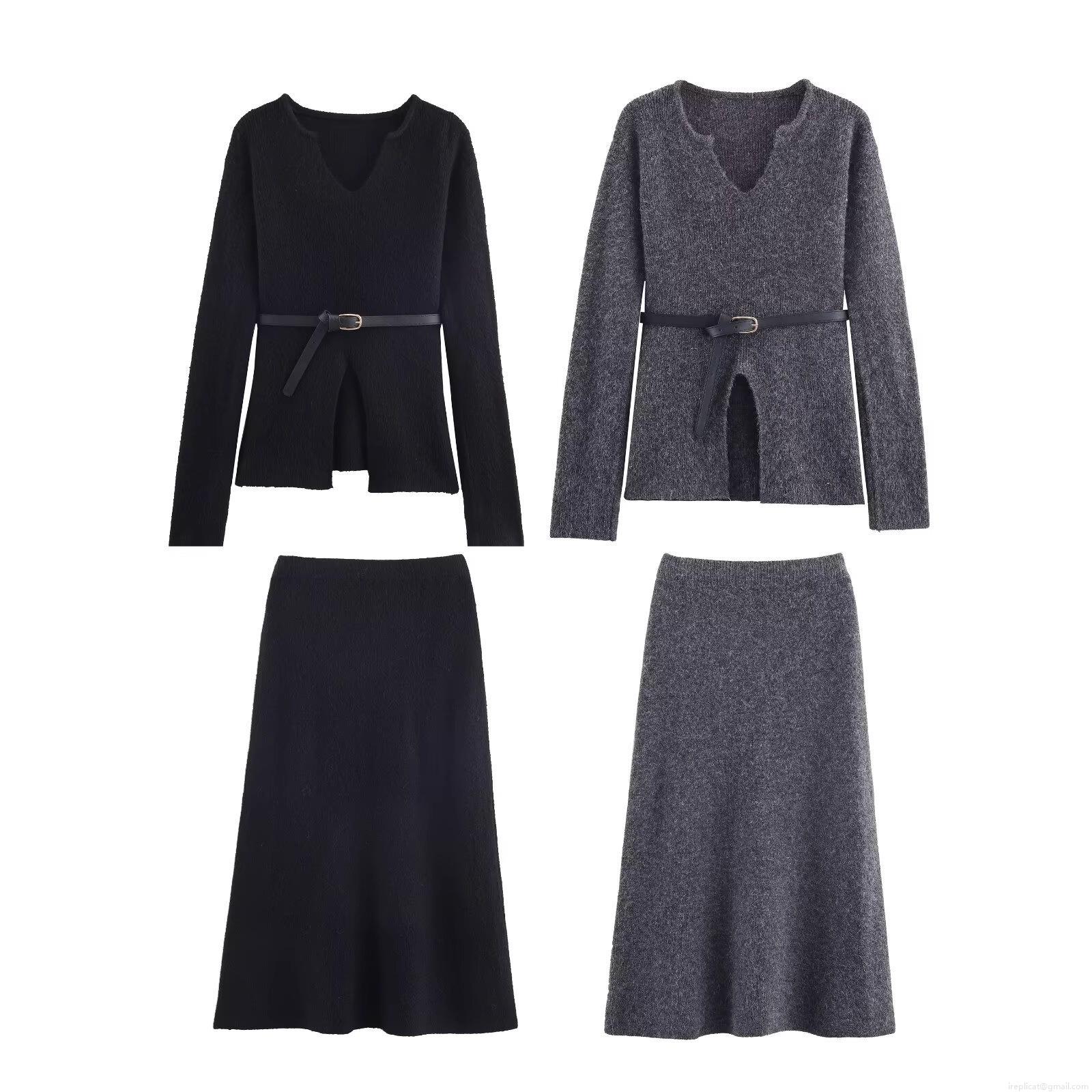 • Women's Knitted Two Piece Skirt Set Elegant V-Neck Long Sleeve Sweater Top With Waist Belt And A-Line Midi Skirt Casual Solid Color Winter Outfits For Women