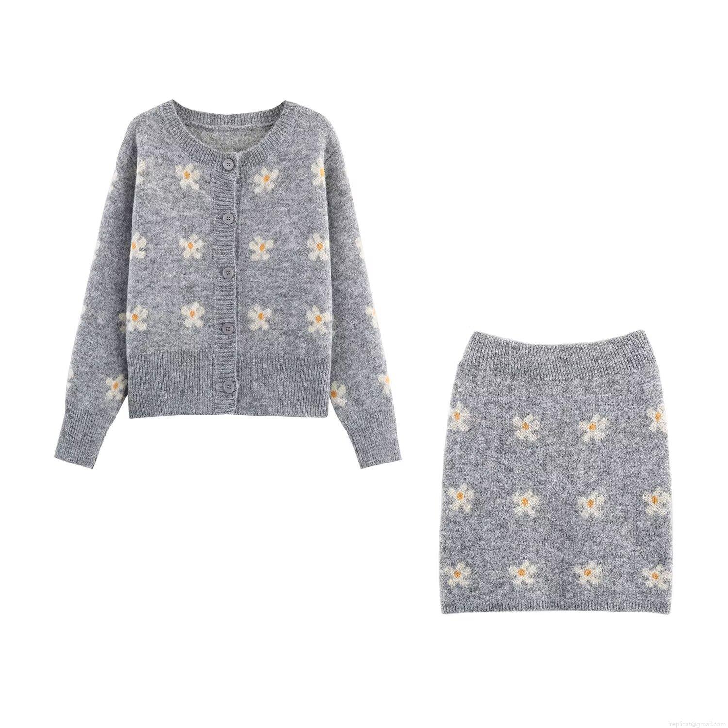 • Women's Knitted Two-Piece Skirt Set Jacquard Small Floral Button Up Cardigan and Mini Skirt 100% Polyester Autumn Winter Western Street Style Outfits