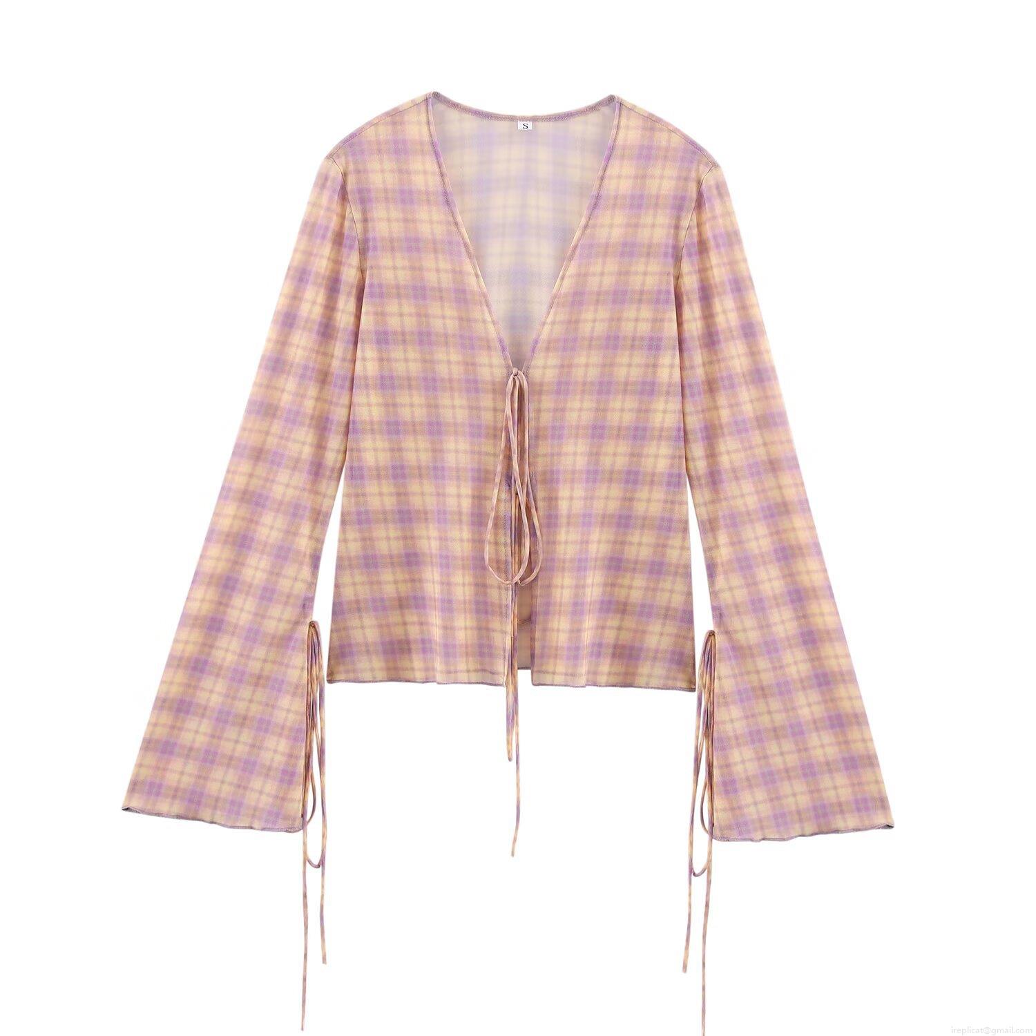 Women's Plaid Mesh Two Piece Set V-Neck Flare Sleeve Lace-Up Shirt And High Waist Mid-Length Skirt Casual Streetwear Purple Yellow Gingham Outfit