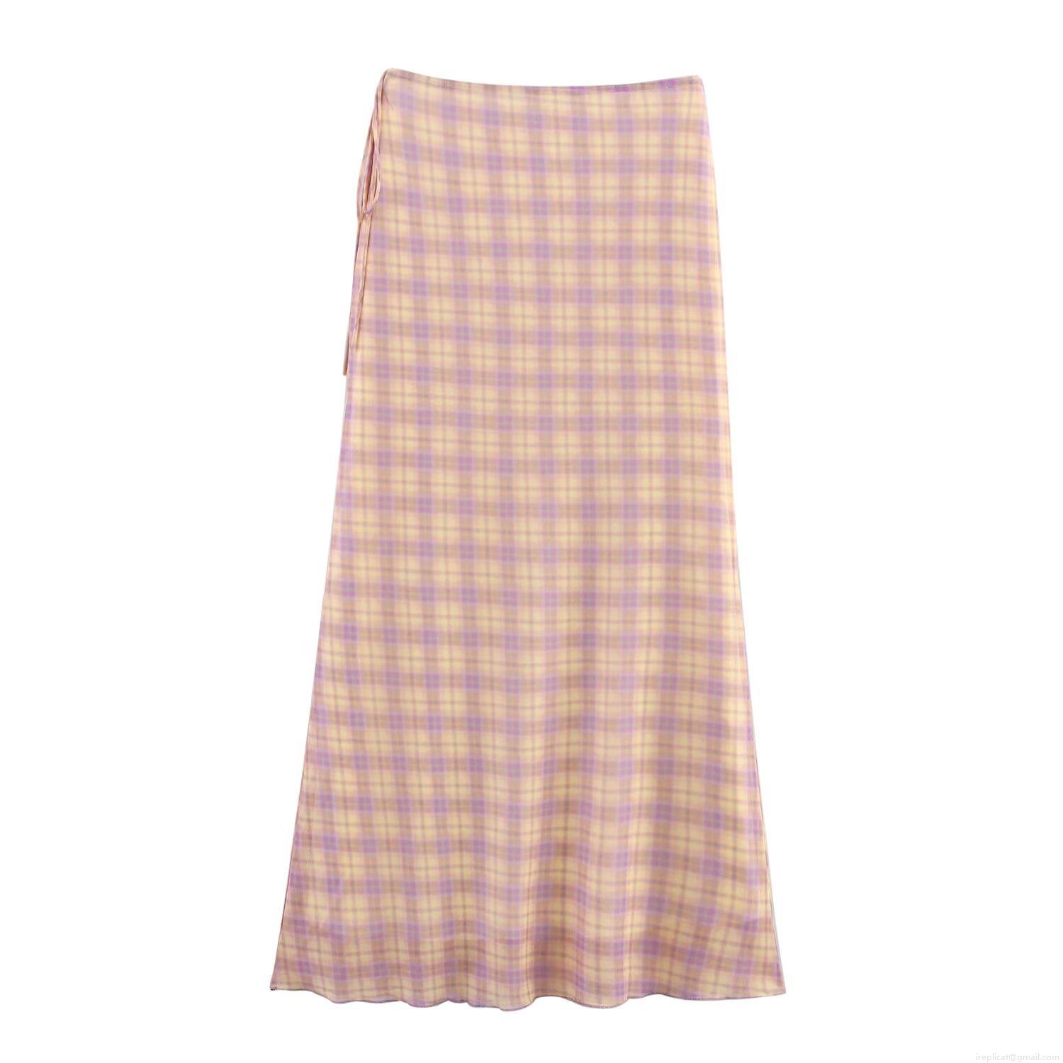 • Women's Plaid Mesh Two Piece Set V-Neck Flare Sleeve Lace-Up Shirt And High Waist Mid-Length Skirt Casual Streetwear Purple Yellow Gingham Outfit