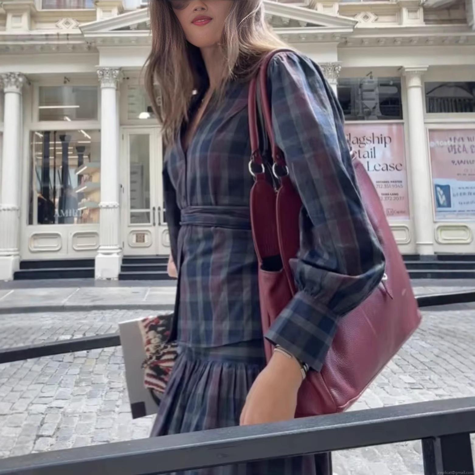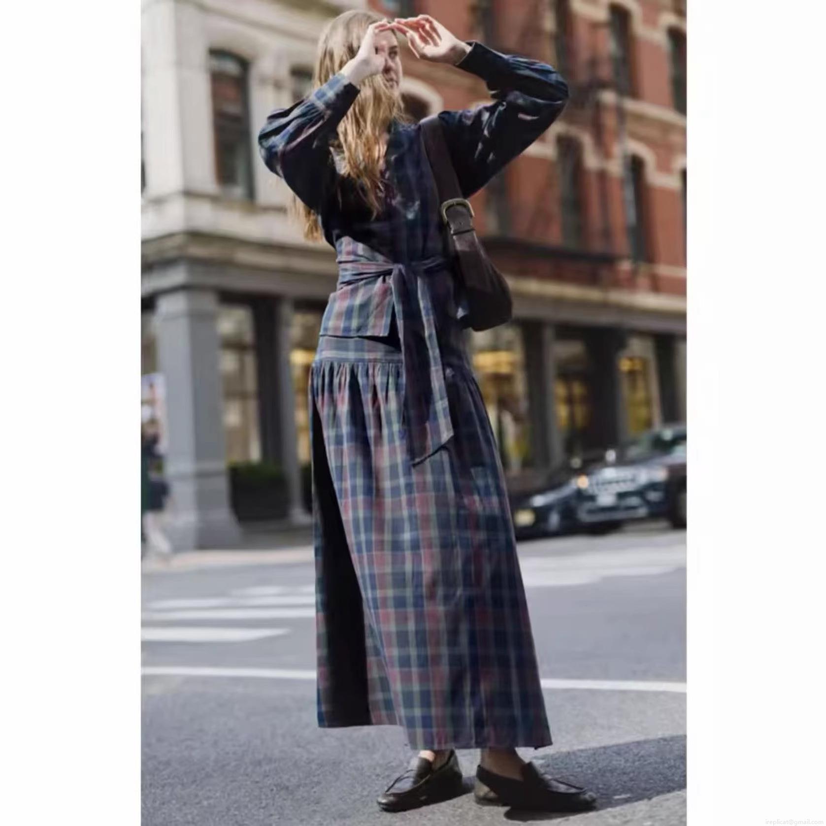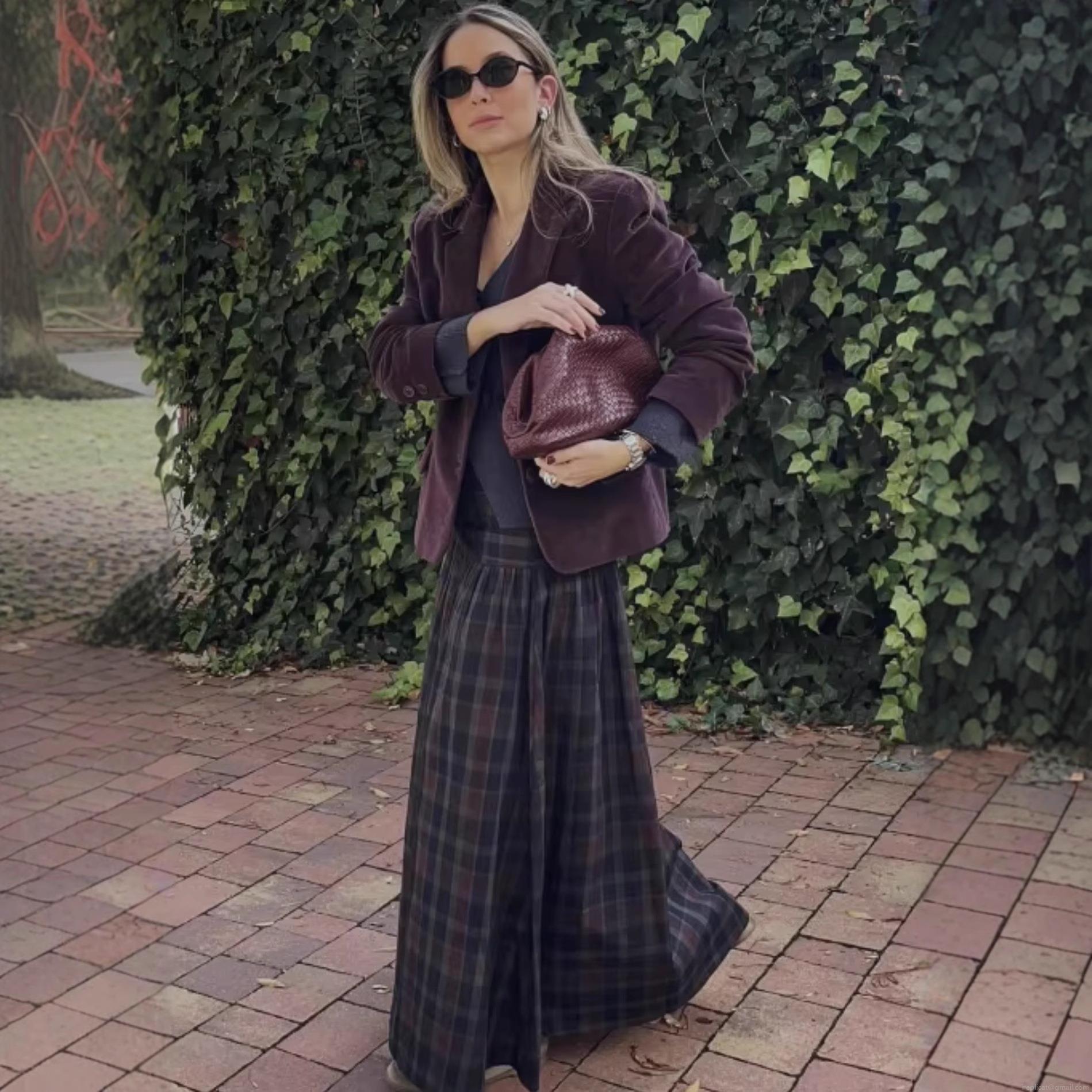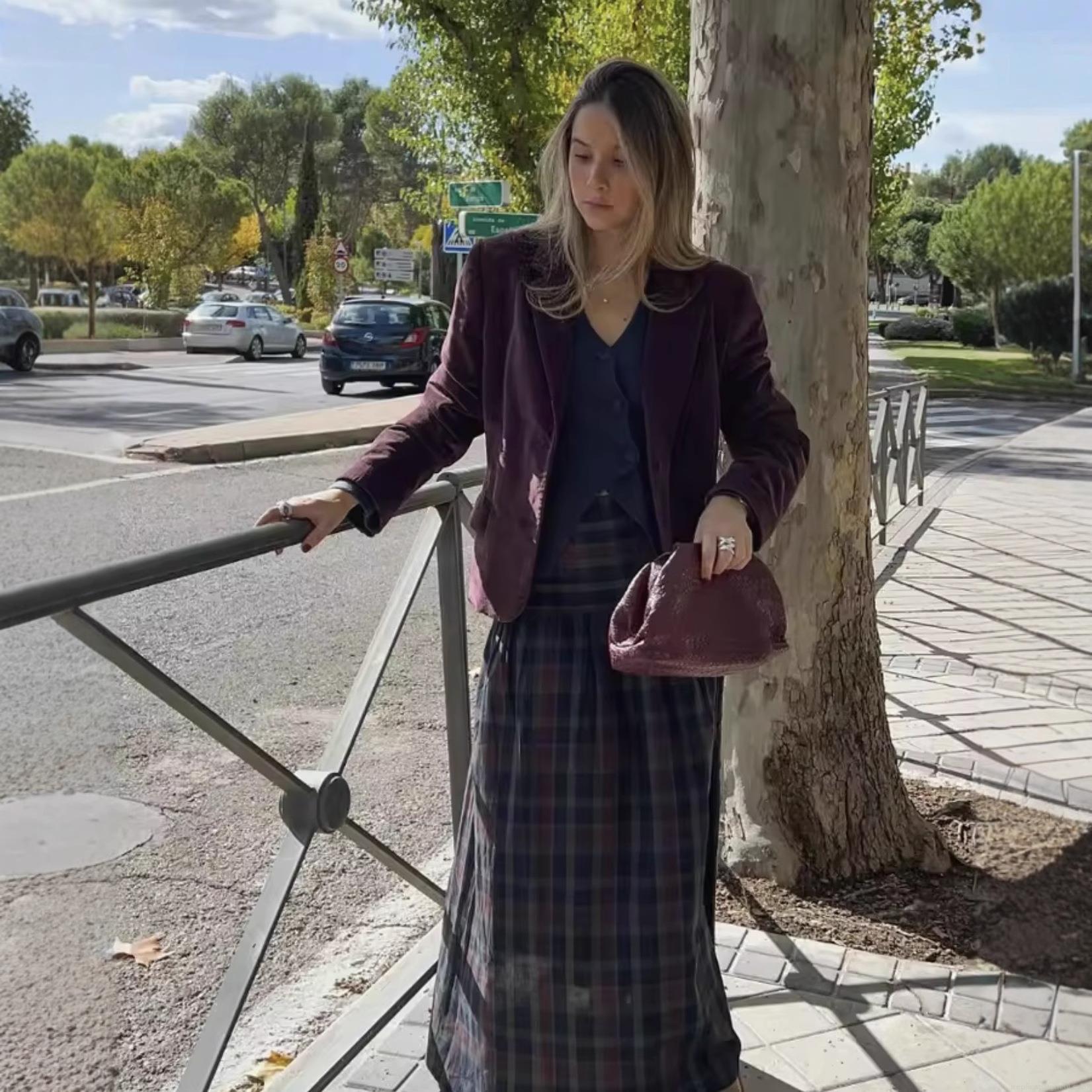 • Women's Retro Plaid Two-Piece Set Long Sleeve V-Neck Top and Maxi Skirt Polyester Casual Streetwear Outfits for Autumn Winter Ladies