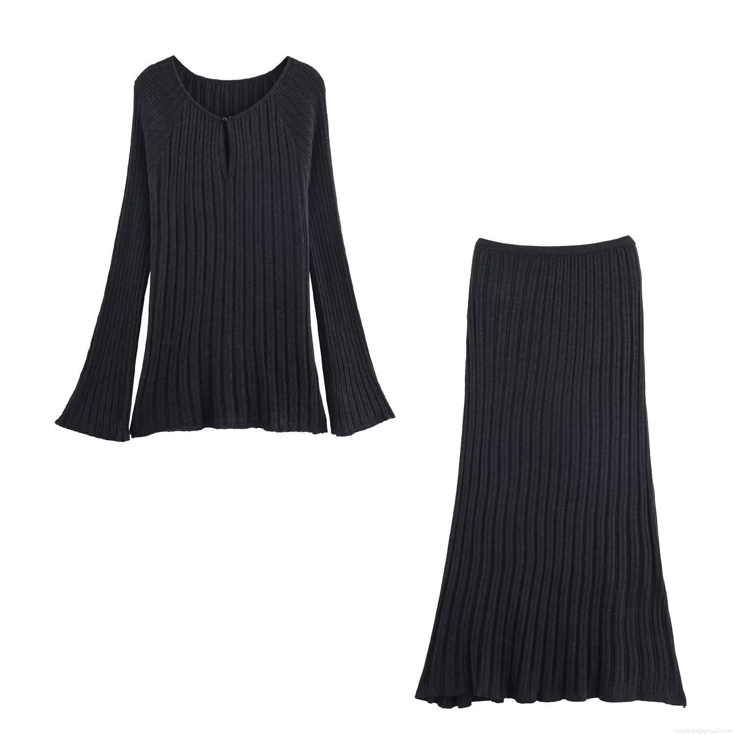 • Women's Ribbed Knit 2 Piece Skirt Set V Neck Long Sleeve Bell Sleeve Top And Midi Skirt Matching Set Autumn Winter Solid Color Slim Fit Outfits