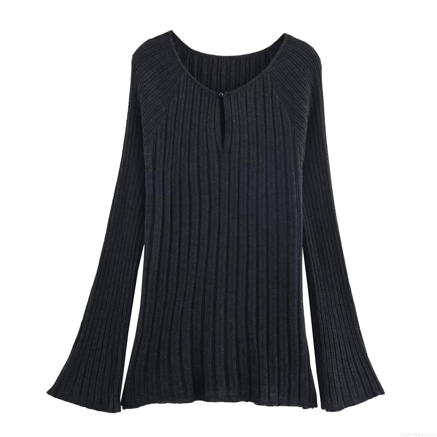Solid Color, V-neck, Single-breasted, Ribbed Decoration, Bell Sleeves, Pit Stripes
