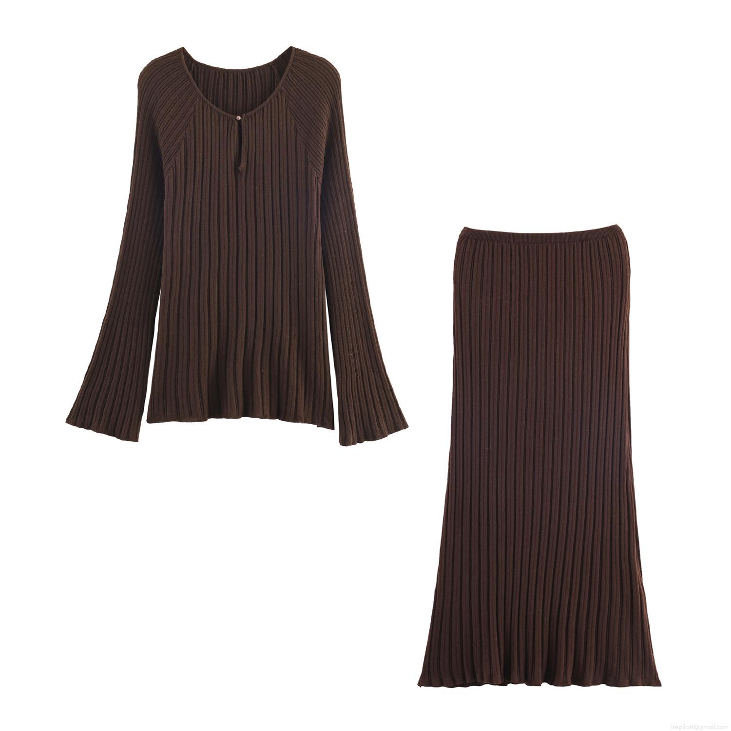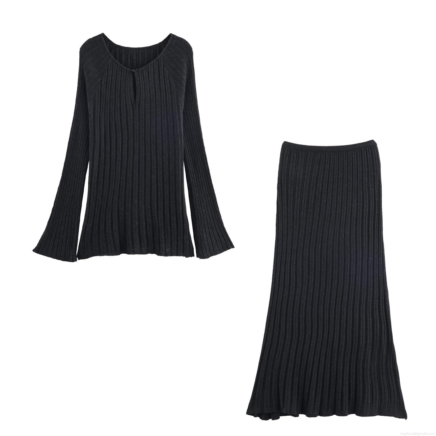 • Women's Ribbed Knit Top and Midi Skirt Set 100% Polyester Long Sleeve V-Neck Slit Two Piece Outfits Elegant Slim Fit Knitted Suits For Daily Casual Streetwear