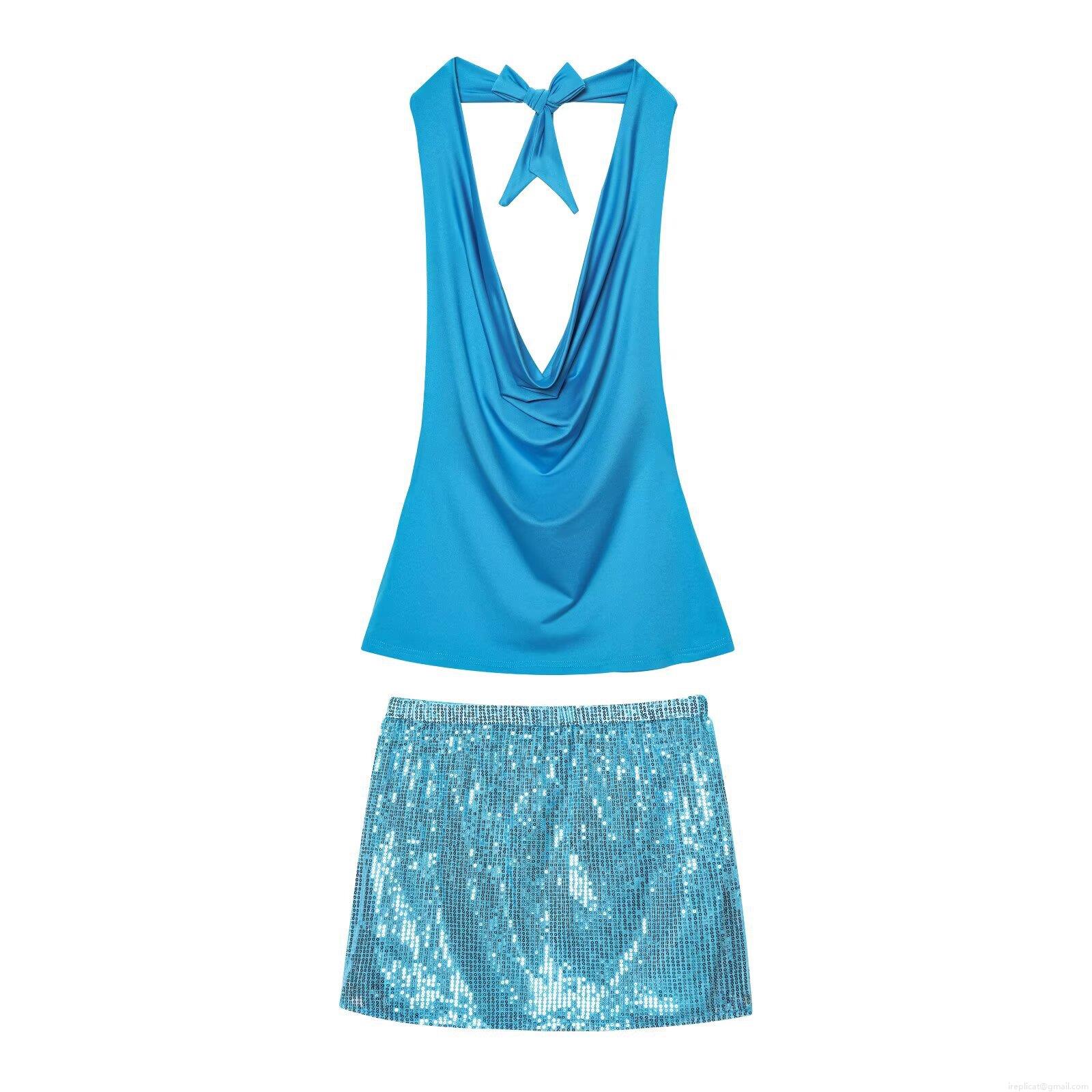 • Women's Sexy 2 Piece Sequin Skirt Set Cowl Neck Backless Halter Top and Mini Sequin Skirt Sparkly Nightclub Party Summer Outfits