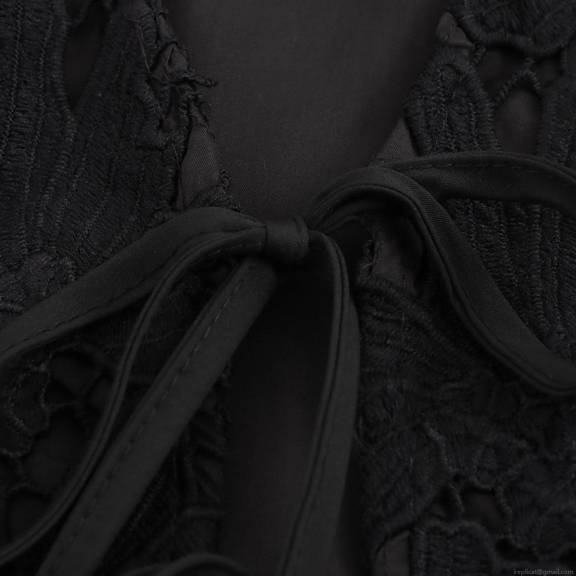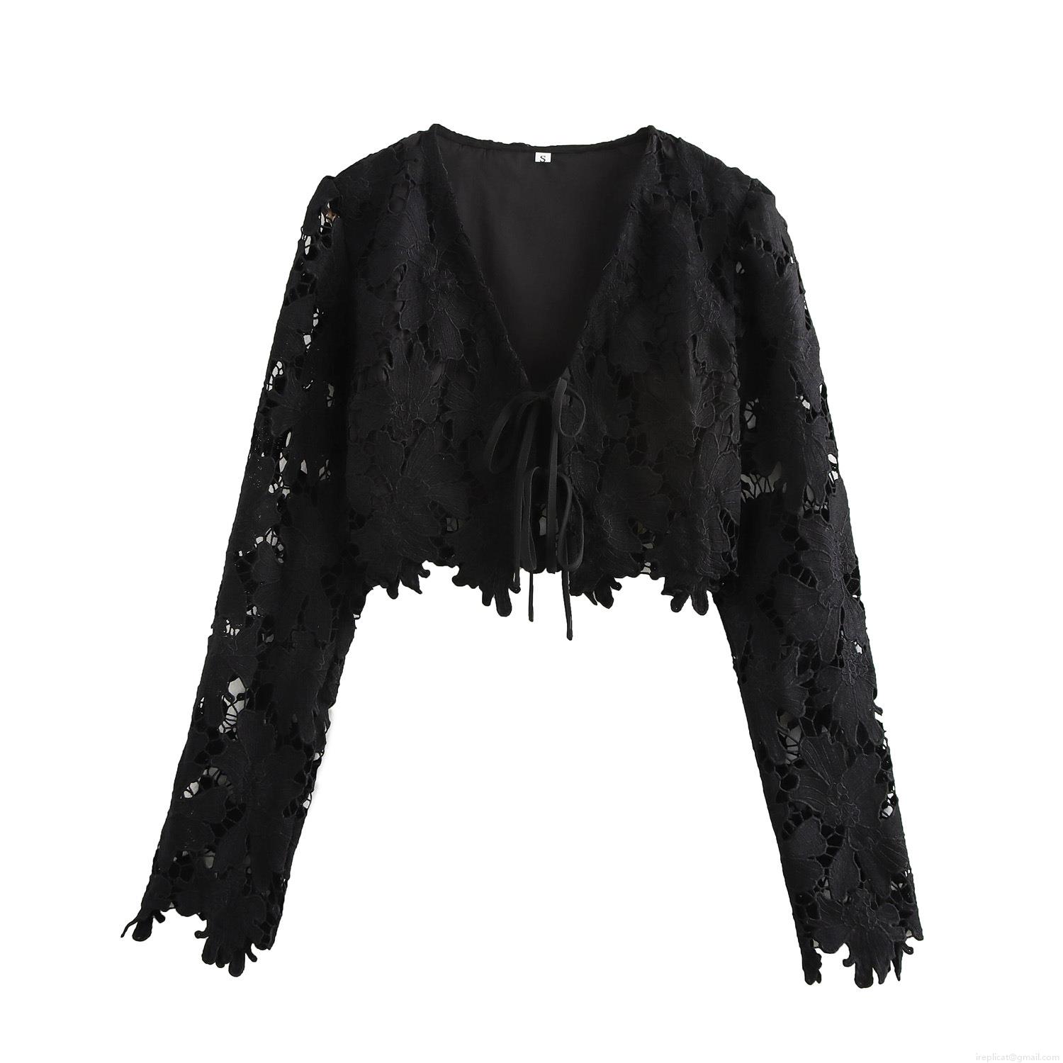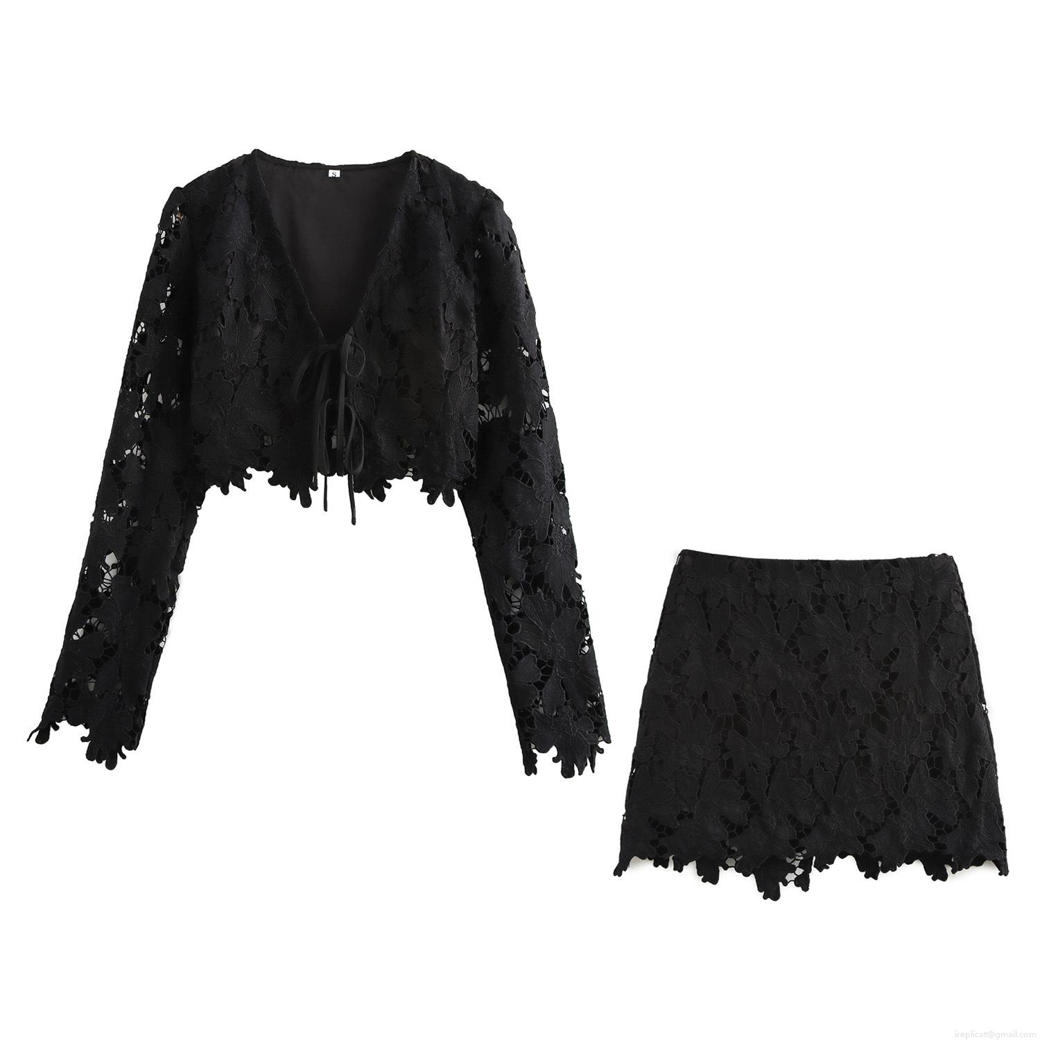 • Women's Sexy Black Lace Two Piece Skirt Set Floral Hollow Out Long Sleeve V Neck Tie-up Cardigan And A-line Mini Skirt Set