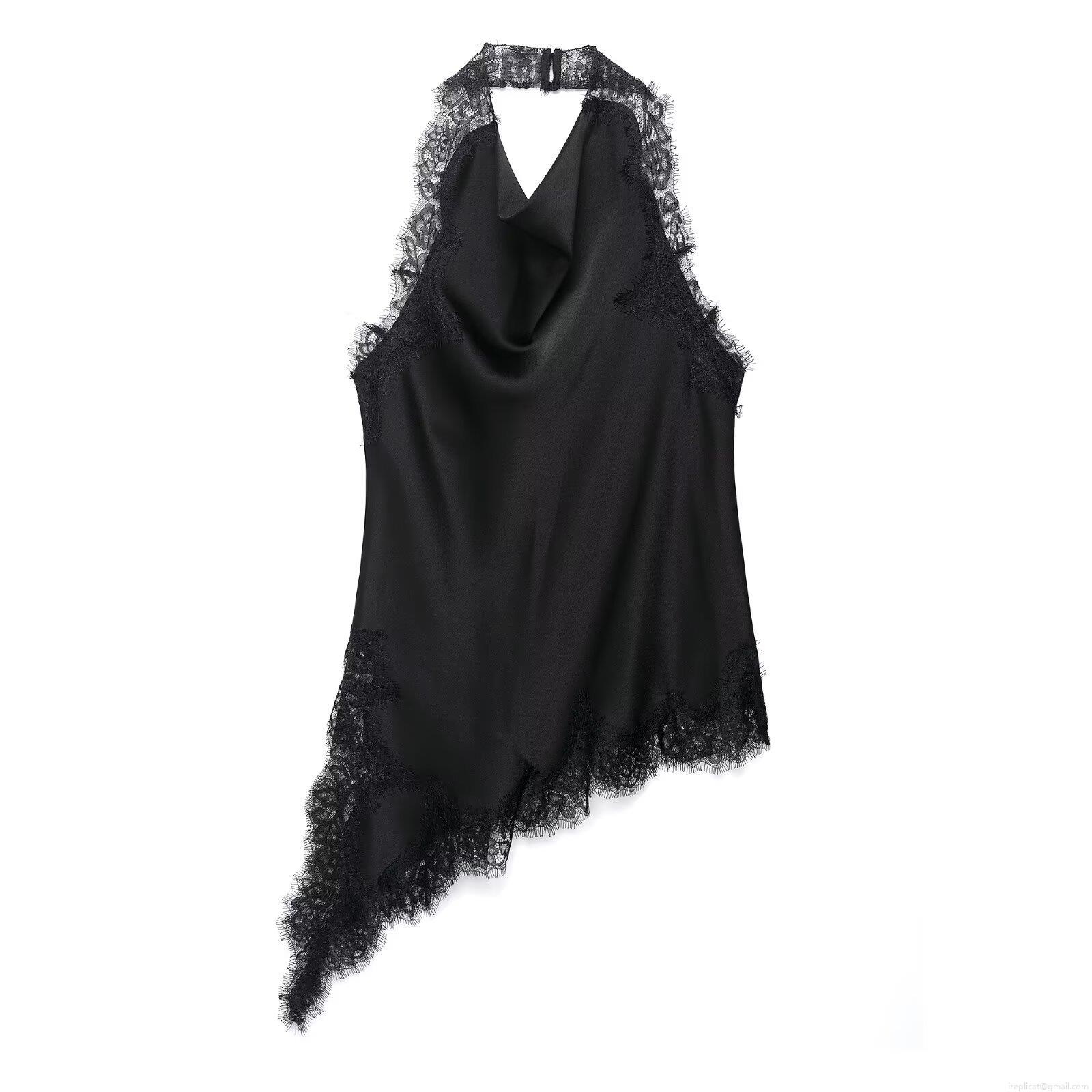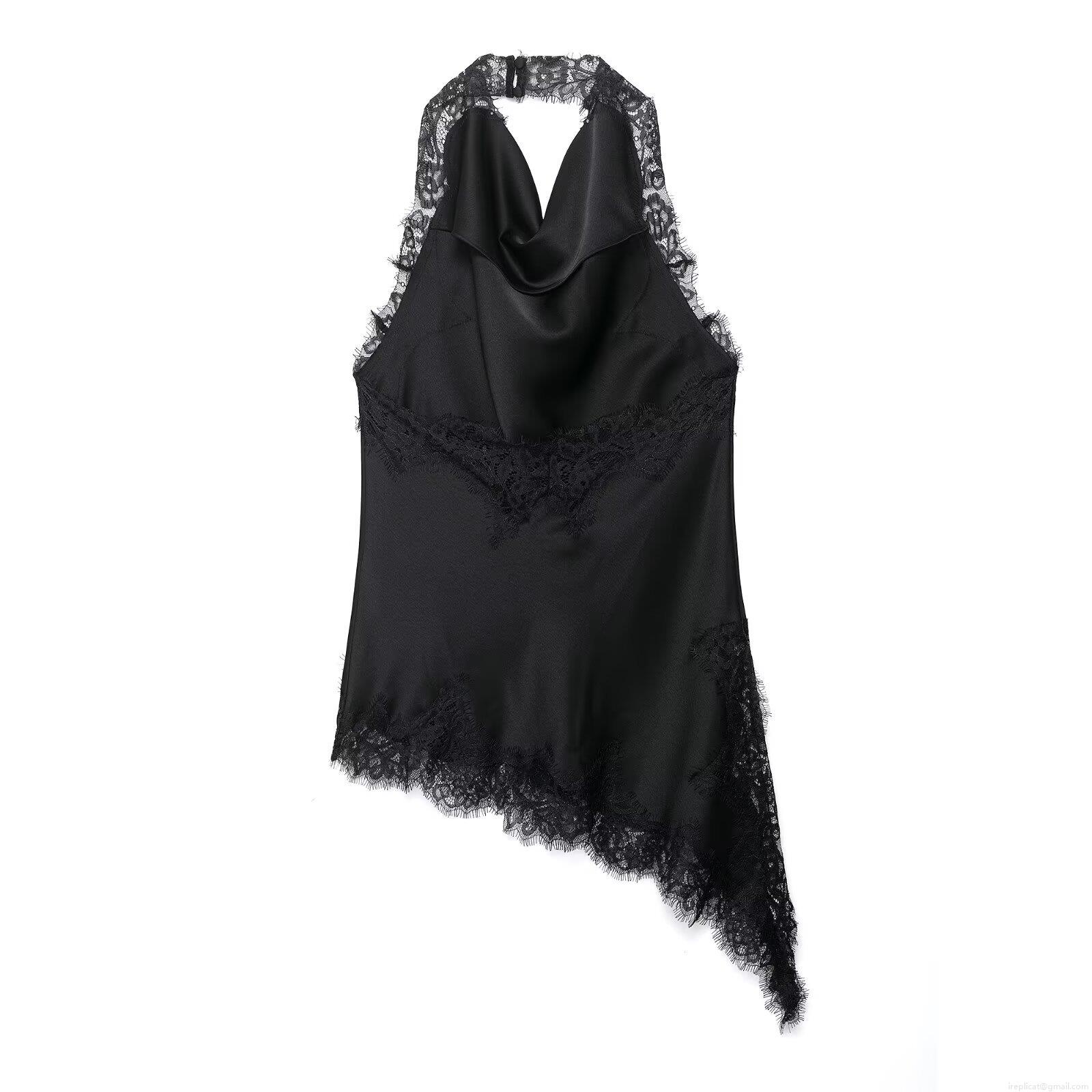 Solid Color, Neckband, Lace Patchwork, Irregular Hem, Satin Texture