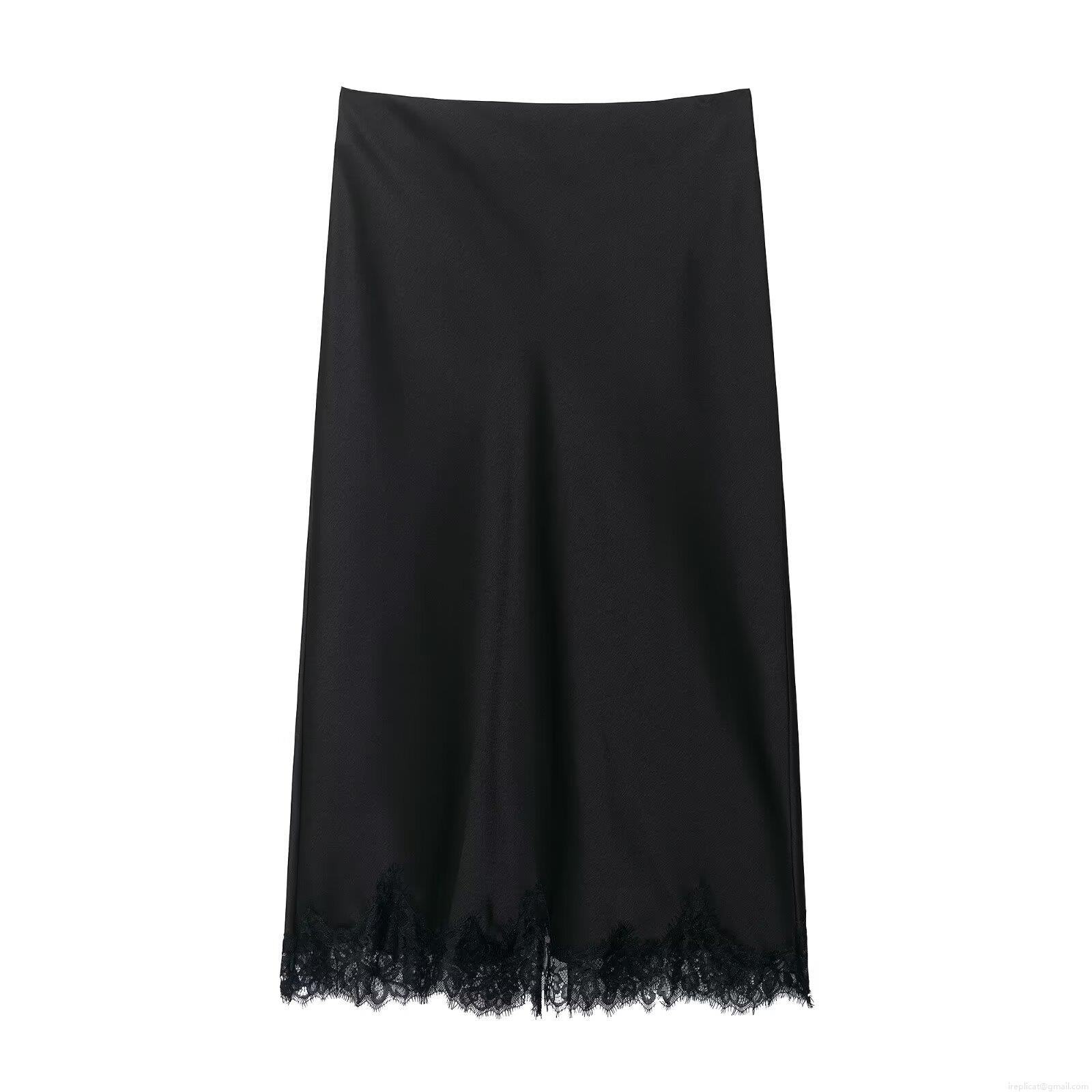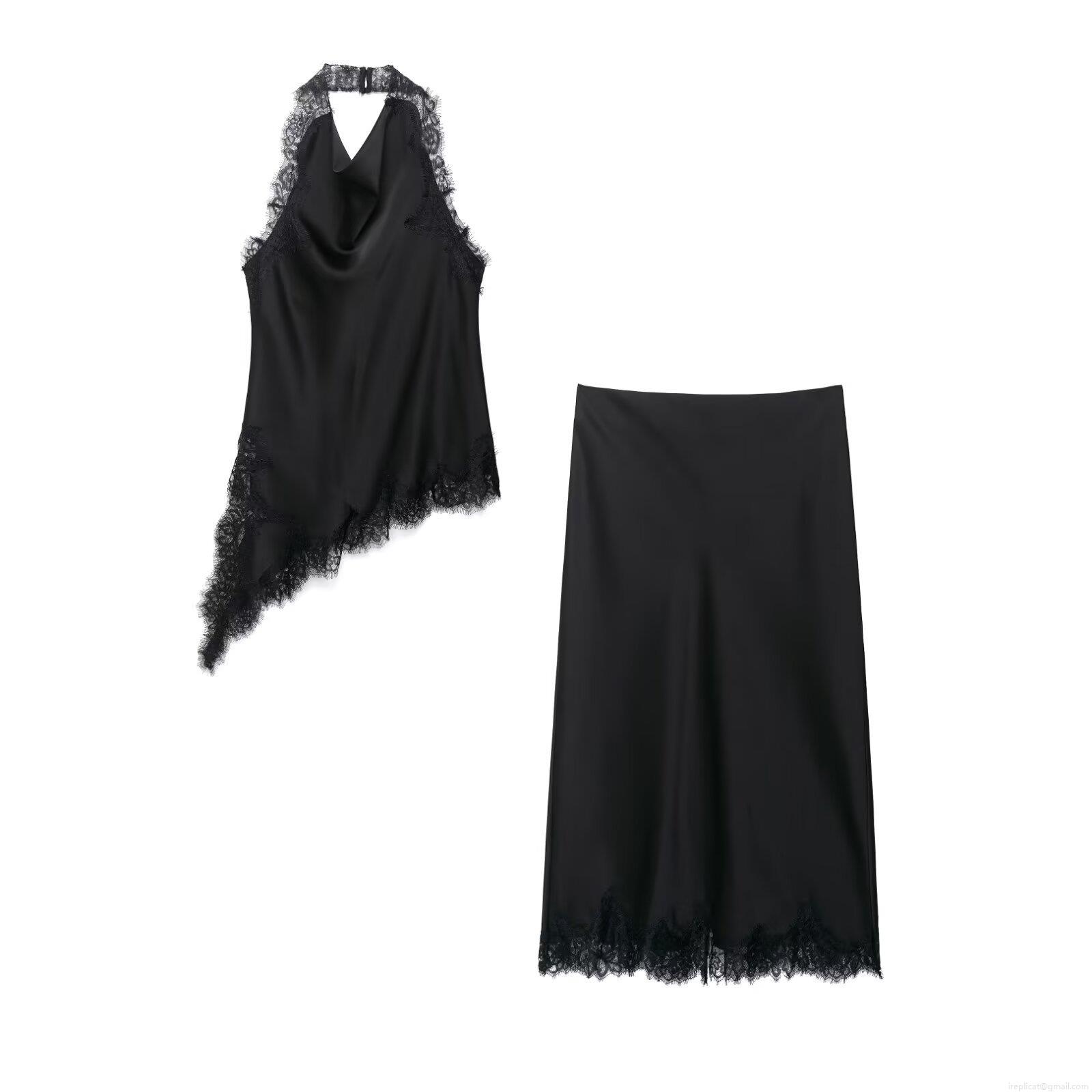 • Women's Sexy Black Satin Lace Splicing Halter Top And Midi Skirt Two Piece Set Elegant Asymmetric Hem Bodycon Outfits Streetwear For Party Clubwear