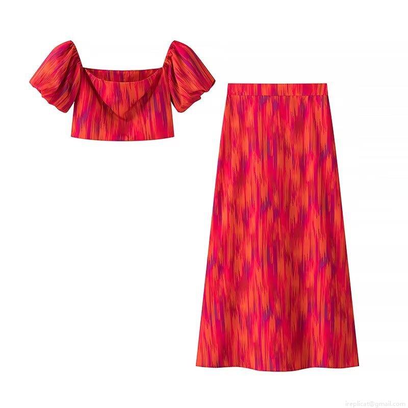 • Women's Sexy Bohemian 2 Piece Skirt Set Polyester Off Shoulder Puff Sleeve Crop Top and High Waist Tie Dye Gradient Maxi Skirt Summer Vacation Beach Outfit
