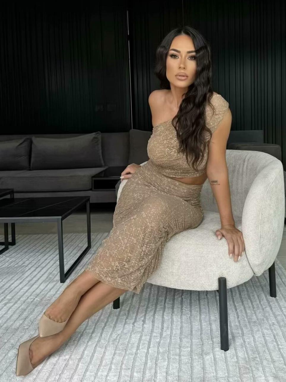 • Women's Sexy Champagne Gold Sequin Ruched Two Piece Set Single Shoulder Crop Top And High Waist Bodycon Long Skirt Elegant Party Club Outfits