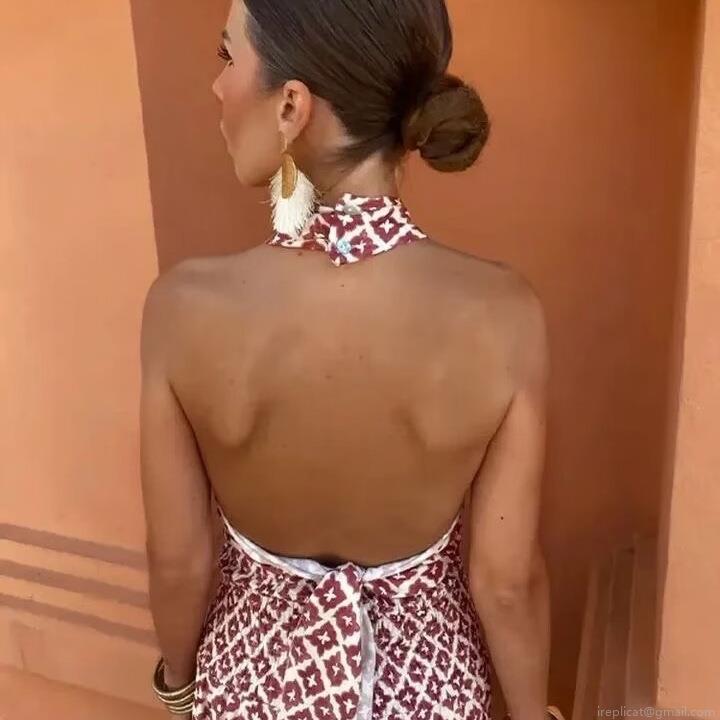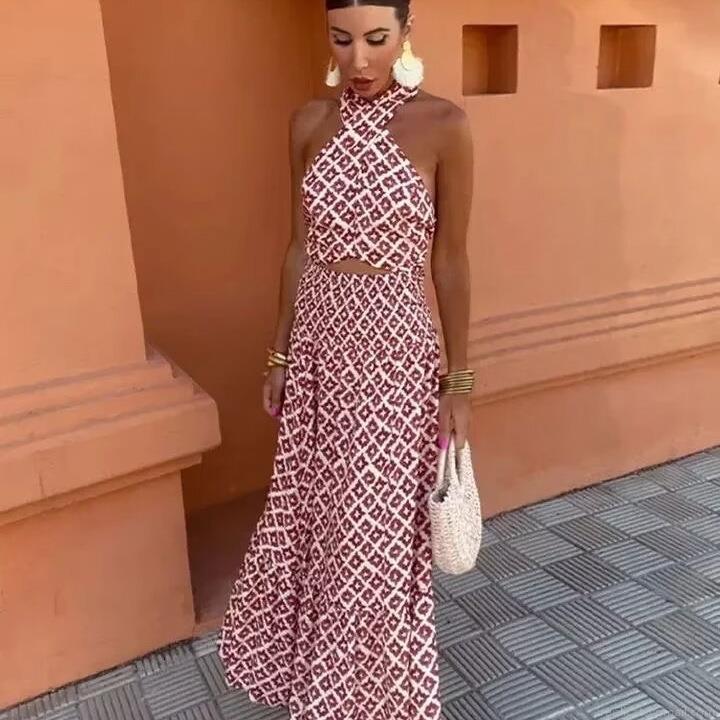 • Women's Sexy Halter Backless Top And Maxi Skirt Set Bohemian Geometric Print Two-Piece Outfit For Summer Beach Vacation Party