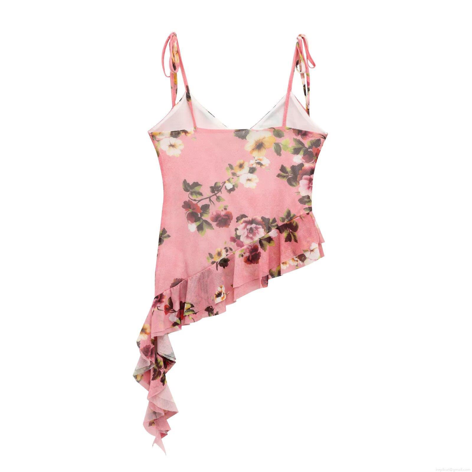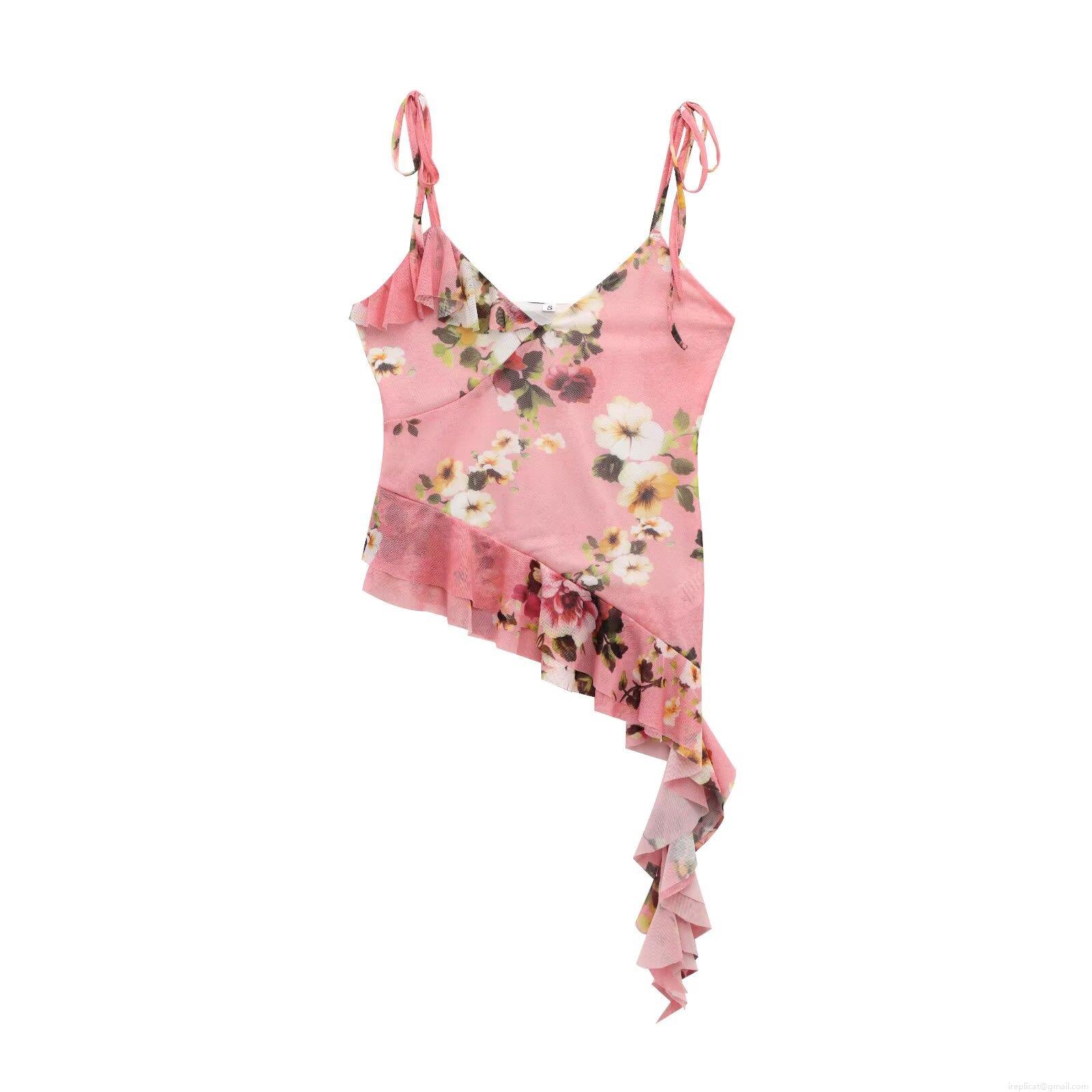 Floral Pattern, Ruffles, Rose, Printing, Mesh, Fishtail Hem, Irregular Cropping