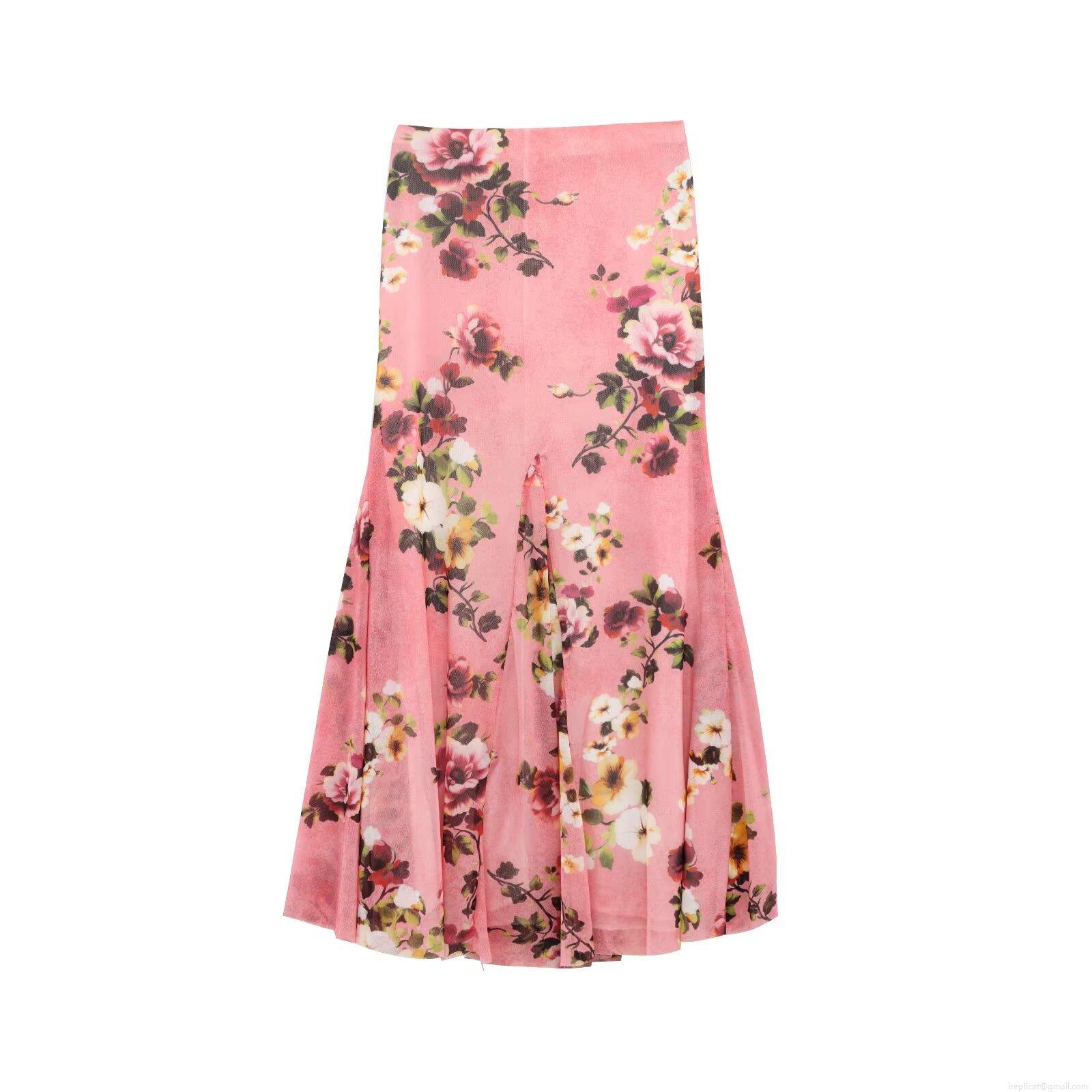 • Women's Sexy Pink Floral Print Mesh 2 Piece Set Irregular Ruffle Cami Top And Fishtail Skirt Elegant Casual Party Vacation Outfit